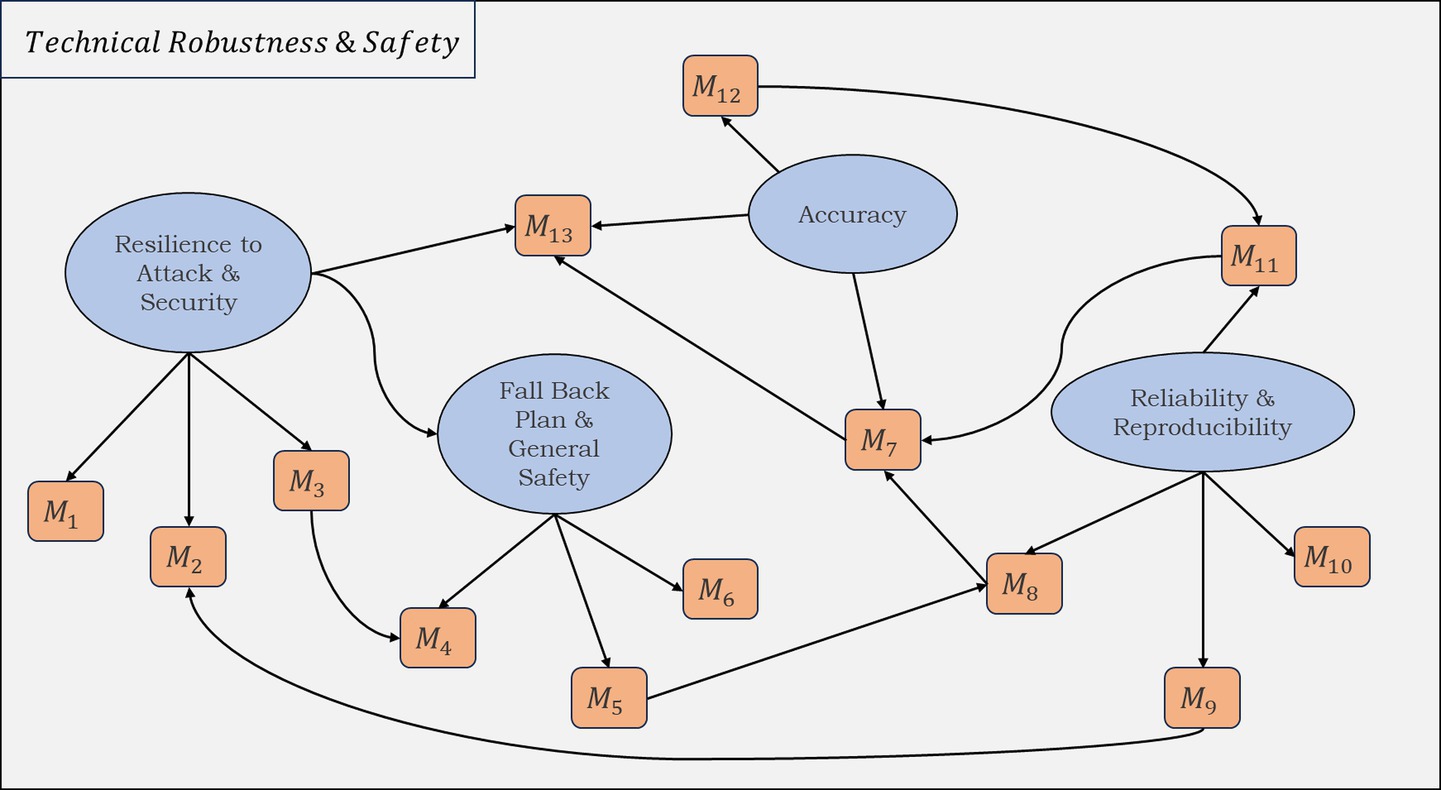 Figure 6. A hypothetical example of the interdependencies among components for the requirement “Technical Robustness & Safety” (top-down approach).