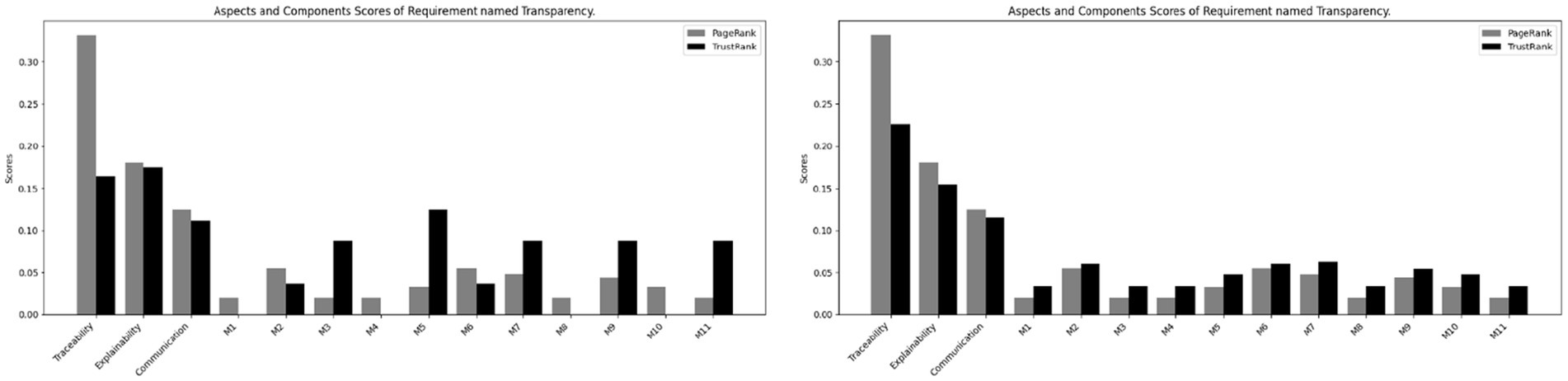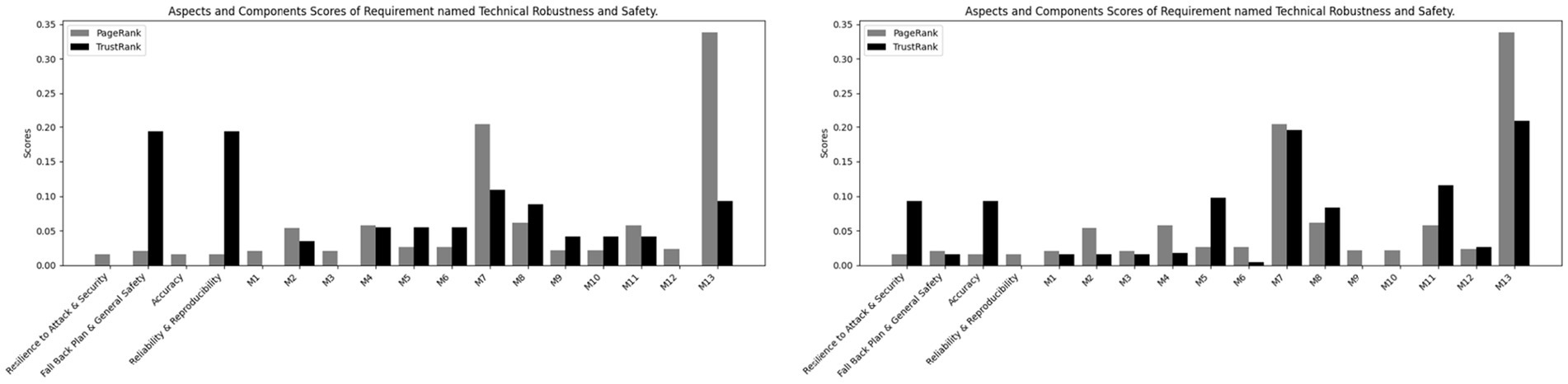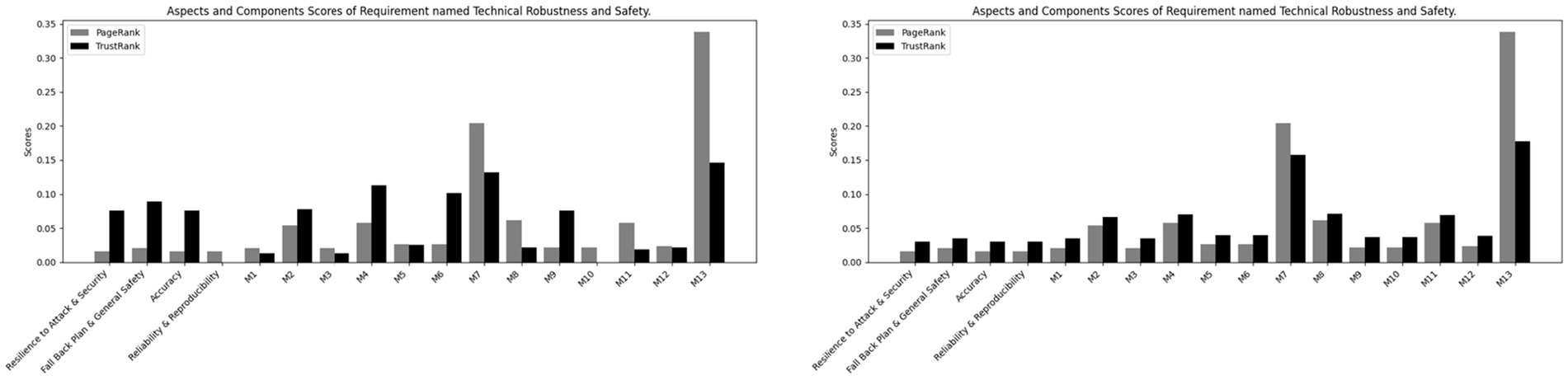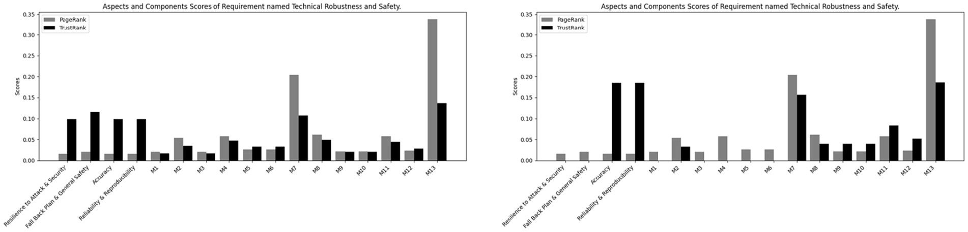 The aforementioned pattern of connections can be described as a top-down approach. In other words, Requirements are linked to their respective Aspects, which are connected to the Components of the AI system they affect. This process occurs in a manner that progresses from the more general entity to the more specific one. Since the PageRank and TrustRank algorithms assign higher scores to nodes at the end of directed links, it is reasonable to assume that entities positioned lower in a top-down hierarchy are likely to receive higher scores, especially in TrustRank. Accordingly, the above-mentioned approach provides a more comprehensive understanding of the degree of trustworthiness associated with the Components of the Aspects of Requirements.
