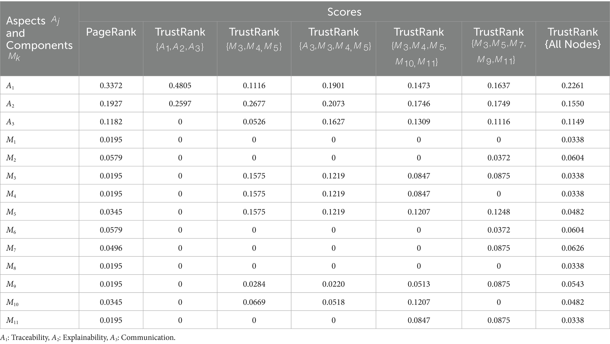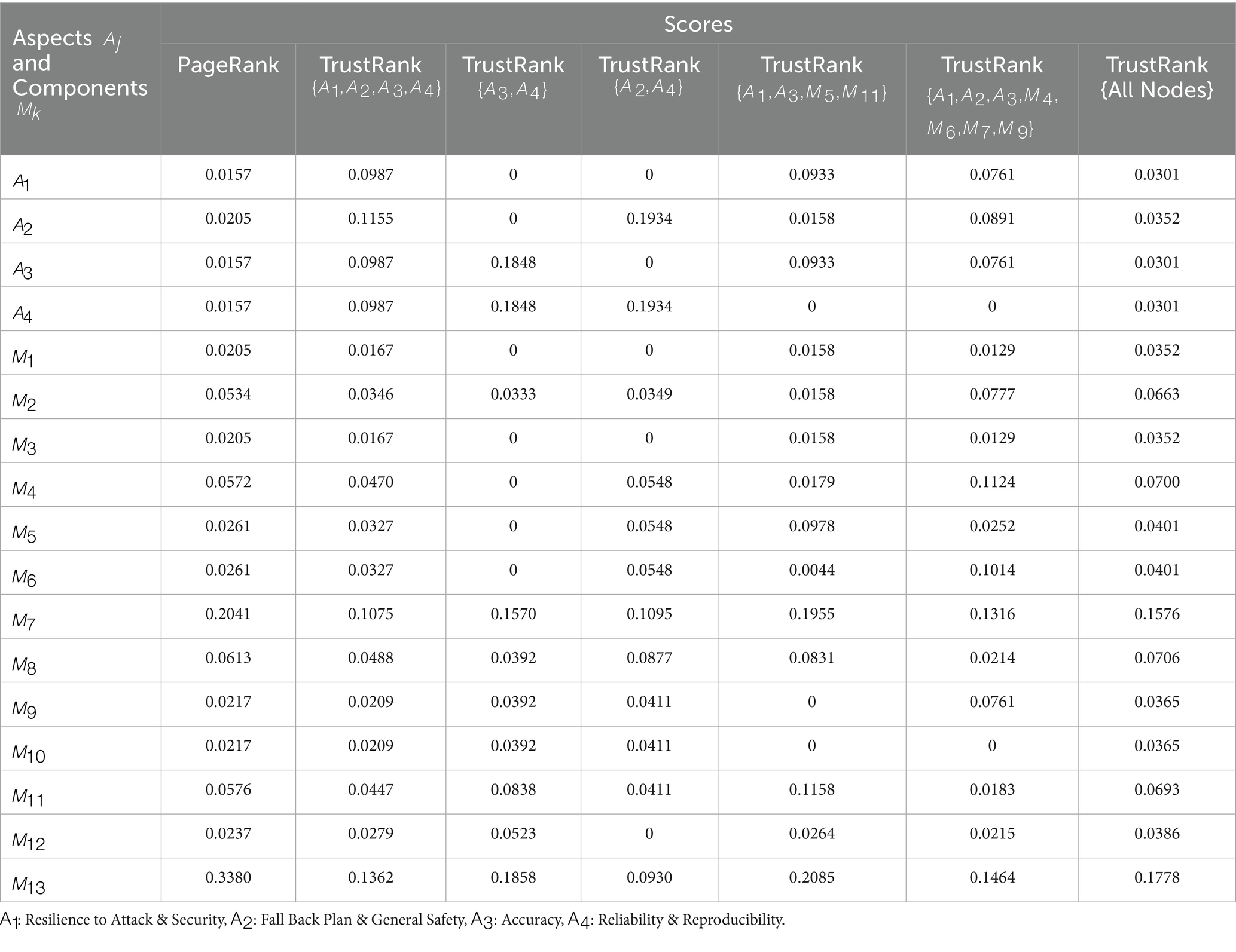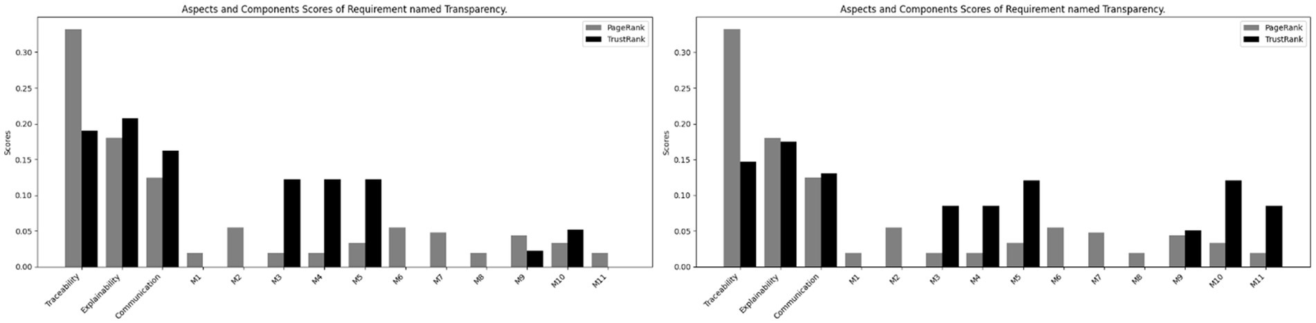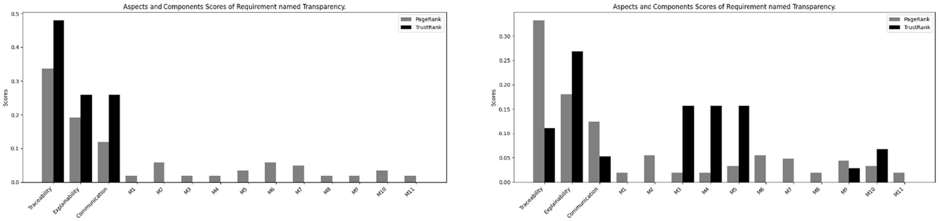 The aforementioned pattern of connections can be described as a top-down approach. In other words, Requirements are linked to their respective Aspects, which are connected to the Components of the AI system they affect. This process occurs in a manner that progresses from the more general entity to the more specific one. Since the PageRank and TrustRank algorithms assign higher scores to nodes at the end of directed links, it is reasonable to assume that entities positioned lower in a top-down hierarchy are likely to receive higher scores, especially in TrustRank. Accordingly, the above-mentioned approach provides a more comprehensive understanding of the degree of trustworthiness associated with the Components of the Aspects of Requirements.