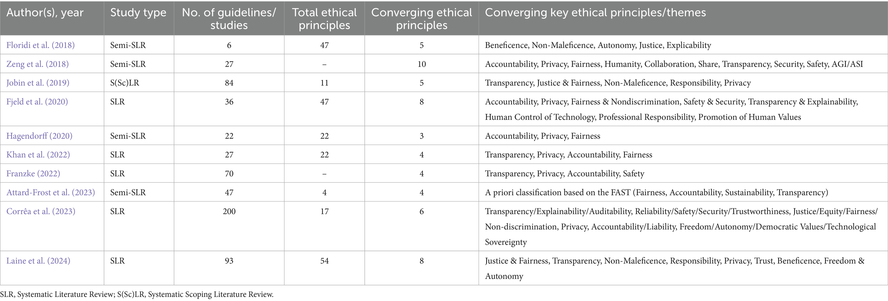 The ethics of AI and its social implications have attracted serious attention, and many policy frameworks and guidelines have been developed by various organizations (Zeng et al., 2018; Franzke, 2022). Additionally, each framework contains different AI ethics principles, which reflect unique perspectives on current and future AI strategies. The AI ethical guidelines serve to indicate to legislators that internal self-governance in science and industry is sufficient and that specific laws are not needed to mitigate potential technological risks and eliminate abuse scenarios (Hagendorff, 2020). It must not be neglected that ethical principles for developing and using AI systems are proposed and contextualized in countless AI ethics guidelines, which prescribe ethical direction to AI systems’ developers, users, policymakers, and other stakeholders who seek to maximize the potential benefits, minimizing at the same time the potential harms of systems’ operations (Attard-Frost et al., 2023). Therefore, we consider it important to see the convergence of these principles in order to establish a set of minimum requirements regarding the trustworthiness of AI systems. We approach the aforementioned issue by comparing various systematic or semi-systematic reviews that have been conducted in the past on the ethical principles that should govern AI systems.