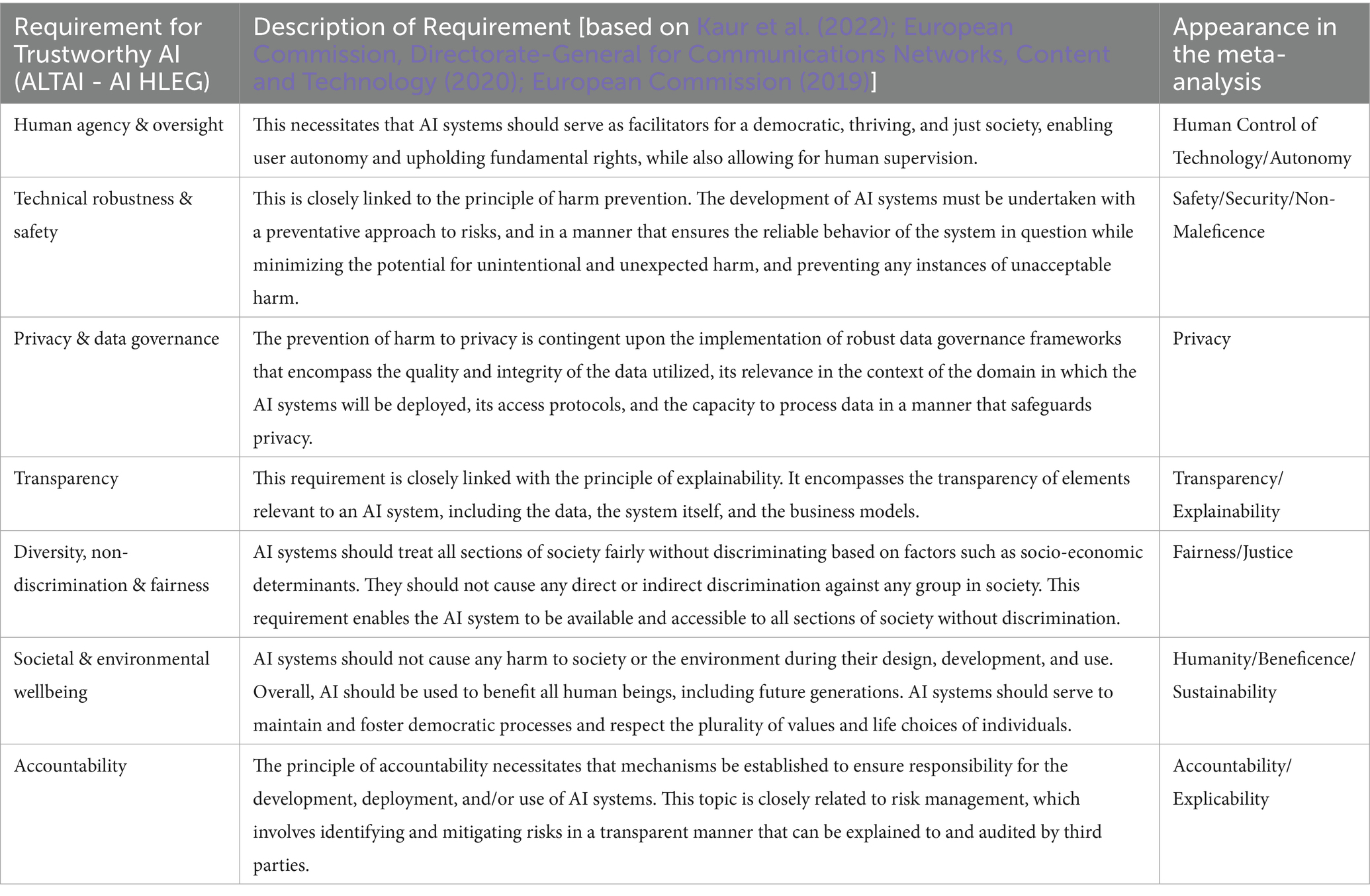 Table 2. Alignment between the results of the meta-analysis and the requirements of the EU about trustworthy AI.