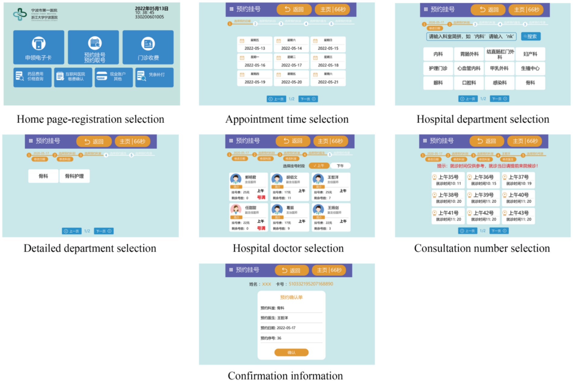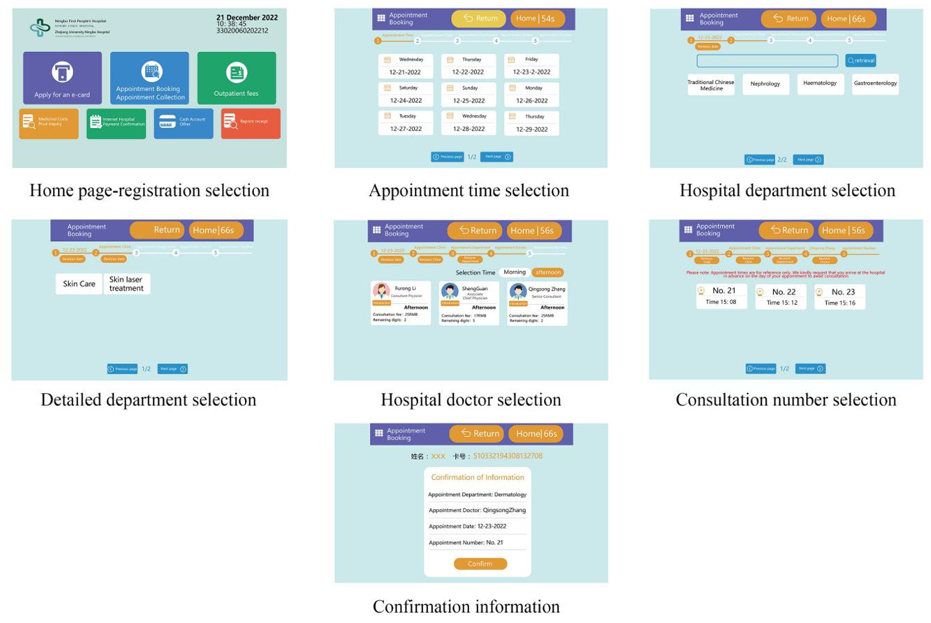Using both web-based and field research, this study analyzed the interfaces of the medical self-service systems in China and used a standard interface of a medical self-service system as the experimental material. Diagram of experimental material consisting of the home page and six other pages for each step in the task to complete a registration (see Figure 1; English version in Figure 2).