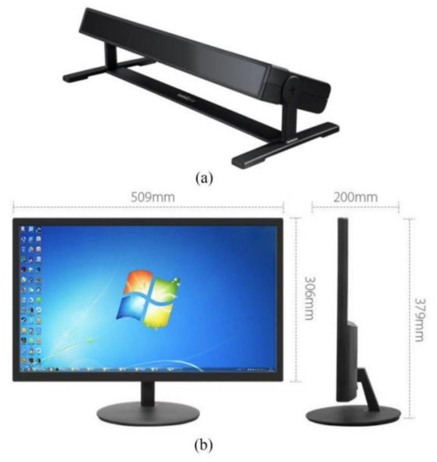 Figure 3. Hardware device of the system. (A) shows the Tobii Pro Spectrum eye-tracking device, (B) shows the 24” IPS bezel-less touchscreen display and Tobii Pro Spectrum.