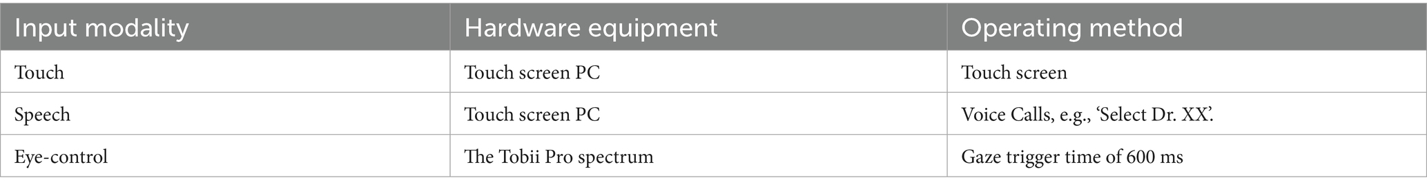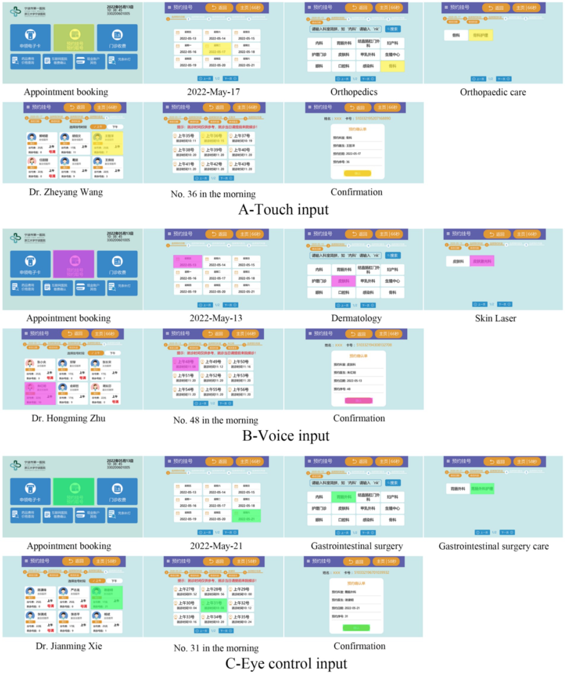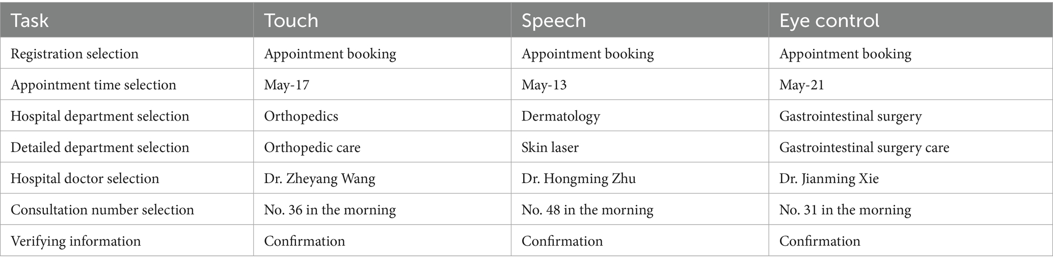 The participants were asked to answer a questionnaire regarding their age, educational background, and experience using self-service system before the start of the experiment. In addition, a visual and auditory ability test was used to screen participants. Prior to the formal experiment, a practice session was implemented to familiarize participants with the experimental procedure. This session also served to verify that their actual operational ability aligned with the experience level identified during pre-screening. Each participant was required to practice three modalities by completing hospital department search tasks, which were different from the experimental task. Training continued until the participants were familiar with and correctly completed the task for each input modality. Then, the Tobii Pro Spectrum device started eye calibration and recorded data. Participants followed the instructions on the display and completed seven medical registration tasks using the input modality, as shown in Table 4. At the end of each level of testing, participants would complete the trust experience questionnaire and NASA to record feedback on their experience. The time it took for each individual to complete all the tests under uniform screen brightness and ambient light ranged from 20 to 30 min, with a 2–5 min delay between each of the three variants of the experiment.