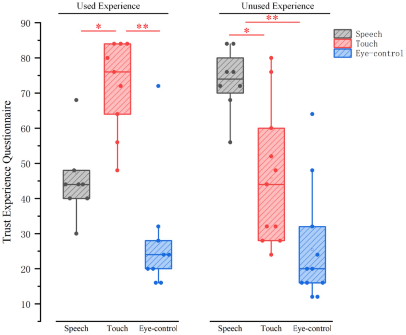 Figure 5. Multiple comparisons of trust experience questionnaire of experience and input modalities.