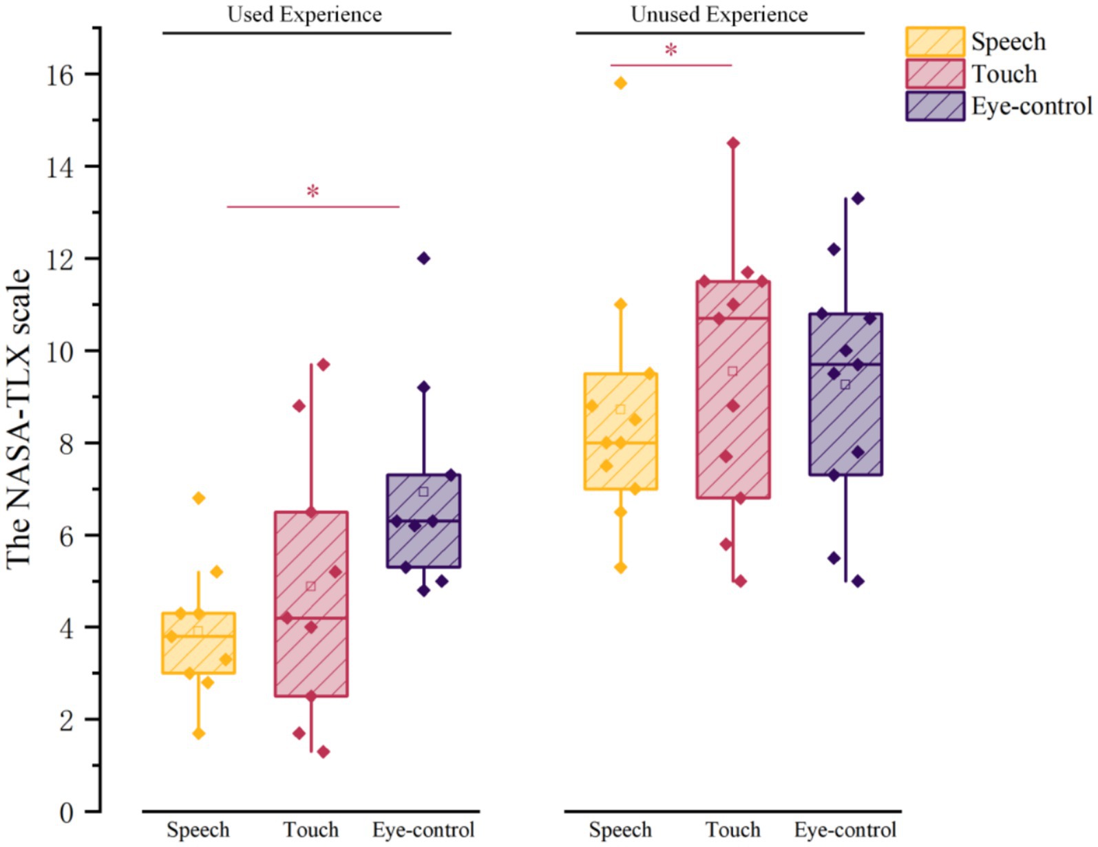 Experience of use (F = 33.172, p = 0.000, η2 = 0.806) and input modality (F = 3.848, p = 0.043, η2 = 0.325) had a differentially significant effect on cognitive load (see Table 1). Older adults with use experience had a lower cognitive load (M = 5.241, SD = 0.380) compared to those without use experience (M = 9.119, SD = 0.518). Speech input (M = 5.794, SD = 0.373) had the lowest cognitive load, significantly less than touch input (M = 7.522, SD = 0.751) and eye control input (M = 8.222, SD = 0.623). All older adults had the lowest cognitive load using speech input; experienced older adults had a significantly lower cognitive load using speech input (M = 3.911, SD = 0.495) than eye-control input (M = 6.93, SD = 0.775); and inexperienced older adults had a significantly lower cognitive load using speech input (M = 7.678, SD = 0.425) than touch input (M = 10.167, SD = 0.954) (see Figure 6).