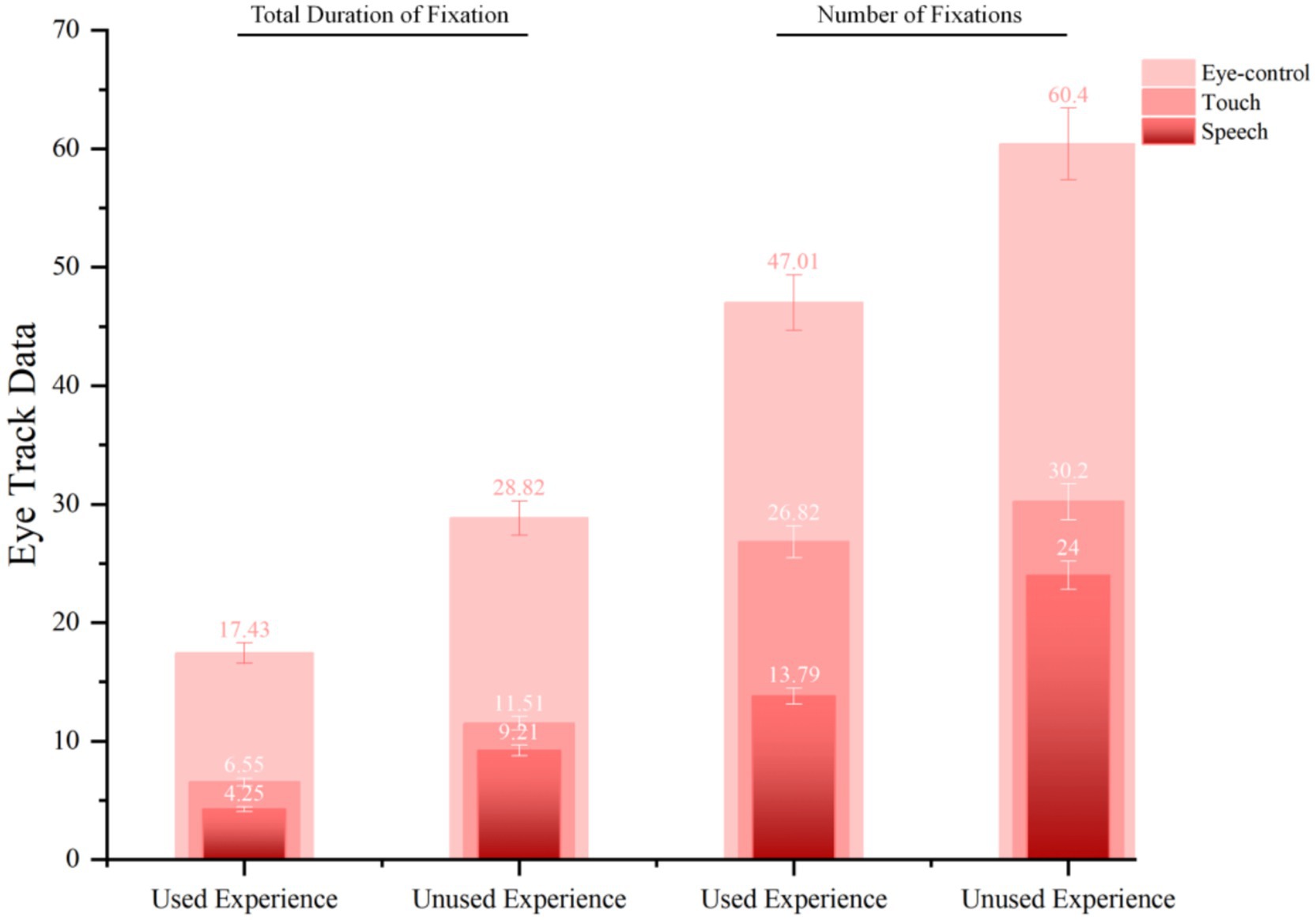 Experience of use (F = 6.611, p = 0.03, η2 = 0.424) and input modality (F = 47.478, p = 0.000, η2 = 0.841) had a differentially significant effect on total duration of fixation. There was no significant difference in the number of fixations for older adults’ experience (F = 3.227, p = 0.106, η2 = 0.264). Input modality significantly impacted the number of fixations (F = 67.865, p = 0.000, η2 = 0.883) (Table 1). Older adults with usage experience had significantly shorter fixation times and fewer fixations for speech input (M = 4.247, SD = 0.404) (M = 13.786, SD = 5.487) compared to touch input (M = 6.553, SD = 0.783) (M = 26.819, SD = 2.212) and eye-control input (M = 17.426, SD = 1.088) (M = 47.069, SD = 5.225). Older adults with no usage experience had significantly shorter fixation times and fewer fixations for speech input (M = 9.205, SD = 1.138) (M = 24, SD = 1.972) and touch input (M = 11.514, SD = 1.852) (M = 30.2, SD = 3.999) compared to eye-control input (M = 28.817, SD = 5.59) (M = 60.4, SD = 5.884) (see Figure 7).