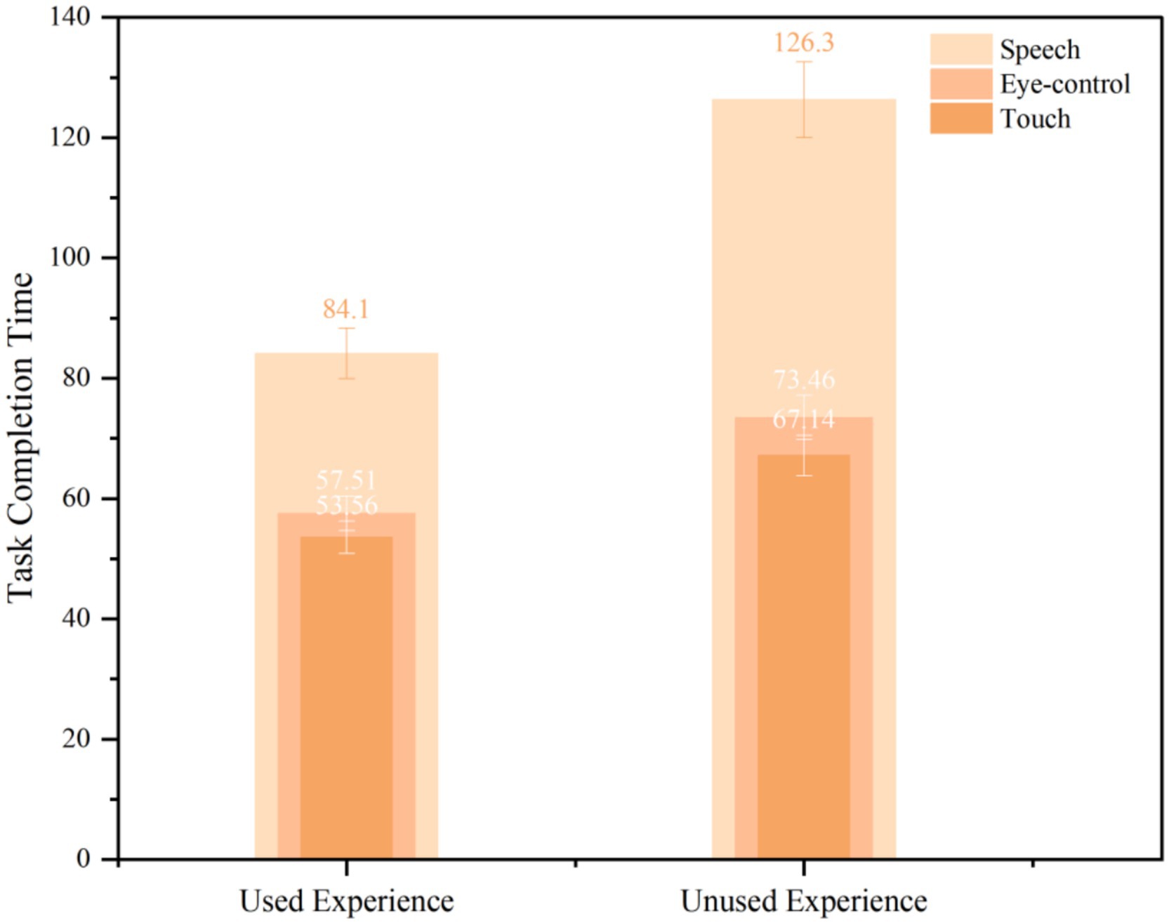 Older adults used experience (F = 19.98, p = 0.002, η2 = 0.689) and input modality (F = 55.489, p = 0.000, η2 = 0.86) to have a significant effect on task completion time (see Table 1). All older adults took significantly longer to complete the task using speech input (M = 84.088, SD = 3.279) (M = 126.302, SD = 7.933) than touch (M = 53.553, SD = 2.868) (M = 67.140, SD = 3.879) and eye-control input (M = 57.514, SD = 3.879) (M = 73.454, SD = 5.702); there was no significant difference between touch and eye-control input in terms of task completion (see Figure 8).