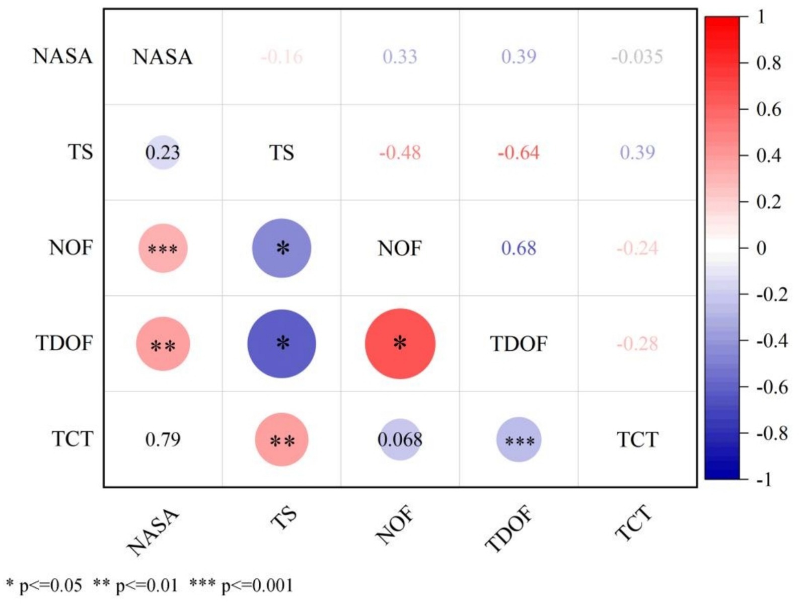 As shown in Figure 9, a Pearson correlation analysis (Pearson, 1895) has been performed on five sets of data, with the first two sets of data being questionnaire data (subjective), the third and fourth sets of data being eye-tracking data (objective), and the fifth set of data being task completion time data (objective). From these three types of data, it can be concluded that NASA is positively correlated with NOF (0.33***, p < 0.001) and TDOF (0.39**, p < 0.01); TS is negatively correlated with NOF (−0.48*, p < 0.05) and TDOF (−0.64*, p < 0.05); NOF is positively correlated with TDOF (0.68*, p < 0.05) was positively correlated; TDOF was negatively correlated with TCT (−0.28***, p < 0.001). Correlation analyses further demonstrated the influence of older adults on the experience of trust with cognitive load. As the cognitive load increased, the eye movement data also increased. Higher eye-movement data indicated lower user trust.