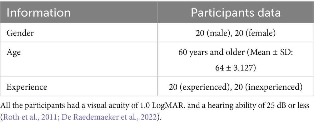 This study recruited 40 participants and a vision and listening ability test was conducted among the participants by using the Chinese version of the Functional Visual Screening Questionnaire (FVSQ) (1991). Each participant was able to walk easily and able to complete tasks independently. Table 1 shows a detailed breakdown of participant demographics.
