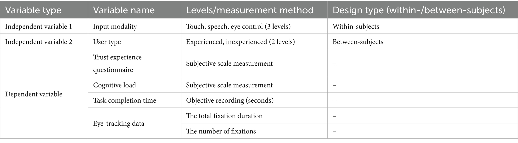 This study employed a mixed-design experiment with two factors: a three-level within-subjects factor of Input Modality (Touch, Speech, Eye Control) and a two-level between-subjects factor of User Type (Experienced, Inexperienced). The design was implemented to systematically evaluate the impact of different interaction modes and prior experience on key dimensions of user experience. Specifically, each participant interacted with all three input modalities, while being assigned to one of the two user type groups. The dependent variables encompassed a multi-dimensional set of metrics, primarily including subjective perceptions (e.g., user trust and cognitive load) and objective behavioral performance (e.g., task completion time), as detailed in the table below. The study recruited a total of 40 participants, comprising an experienced group (n = 20) and an inexperienced group (n = 20). Task completion time was measured in seconds (s) and was recorded for every trial starting from the start cue up until the participants submitted their responses to end each trial. The system cannot tolerate skipping each step, as shown in Table 2.