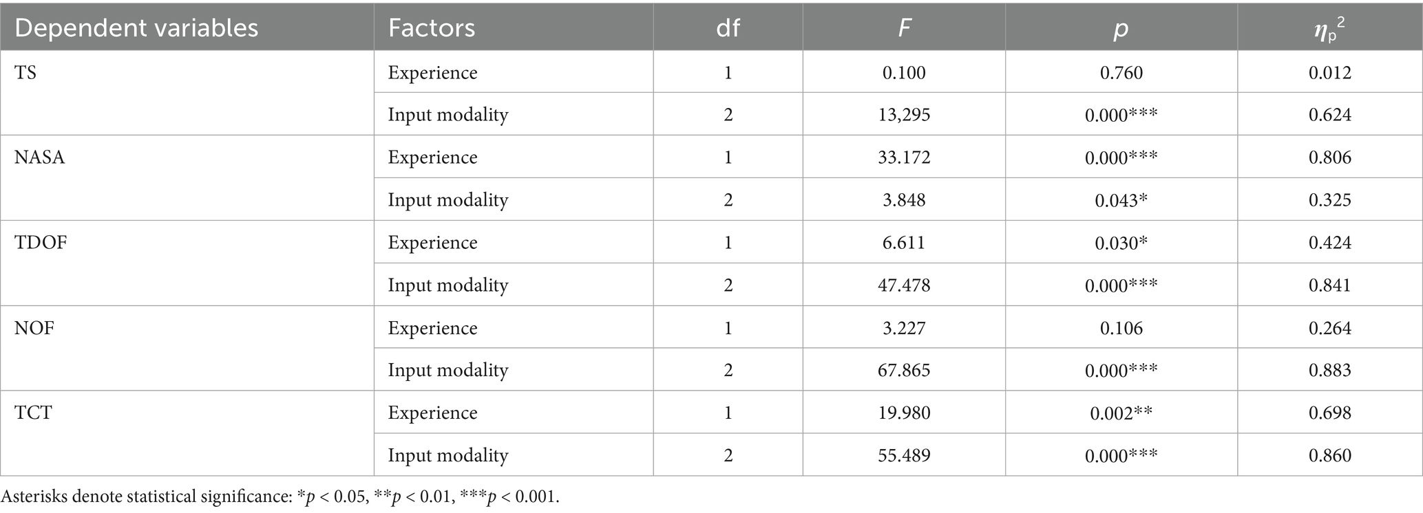 The six experimental conditions (2 user experiences and 3 input modalities) were assessed using five measures: the User Trust Scale, the NASA-TLX Scale, the Total Duration of Fixation, the Total number of Fixations, and the Task Completion Time. Table 5 summarizes the main effects from the analysis of variance (ANOVA) for the six experimental conditions. To facilitate the presentation, we abbreviate the names of the five measures as follows: