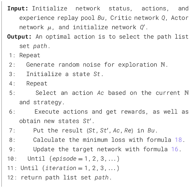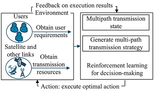 The state St refers to the environmental information perceived by the agent in the entire 7G network. Since the state will change with the change of transmission during the 7G multi-path transmission process, its definition is St = 〈Datauser, 〈Statelinks, node〉〉, where 〈Statelinks, node〉 is the state information of the transmission link and node, such as bandwidth, packet loss rate, delay, and other key information.