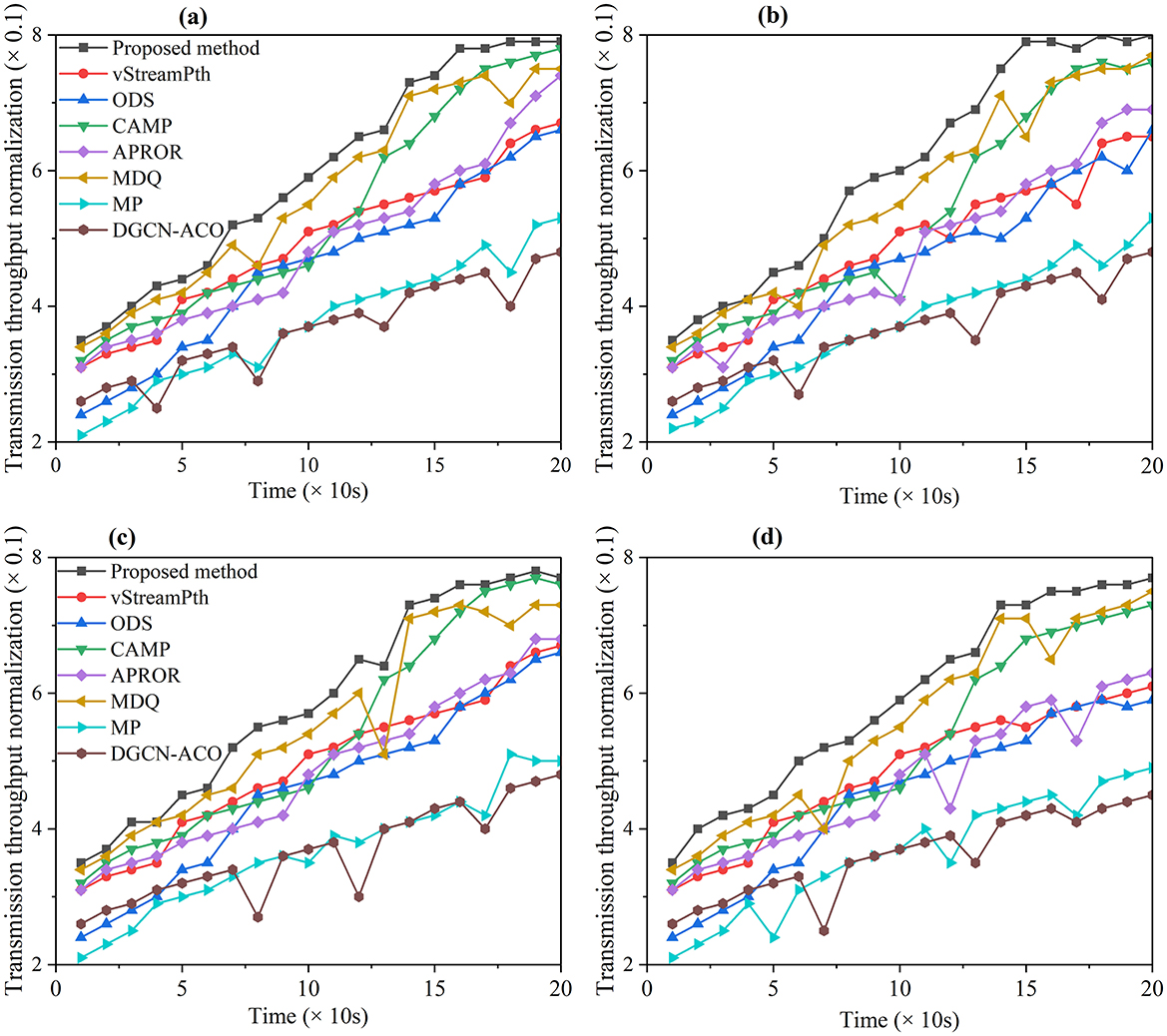 Figure 3. Normalized comparison of transmission throughput. (a) Normal transmission, (b) High load transmission, (c) High packet loss rate transmission, and (d) High delay transmission.