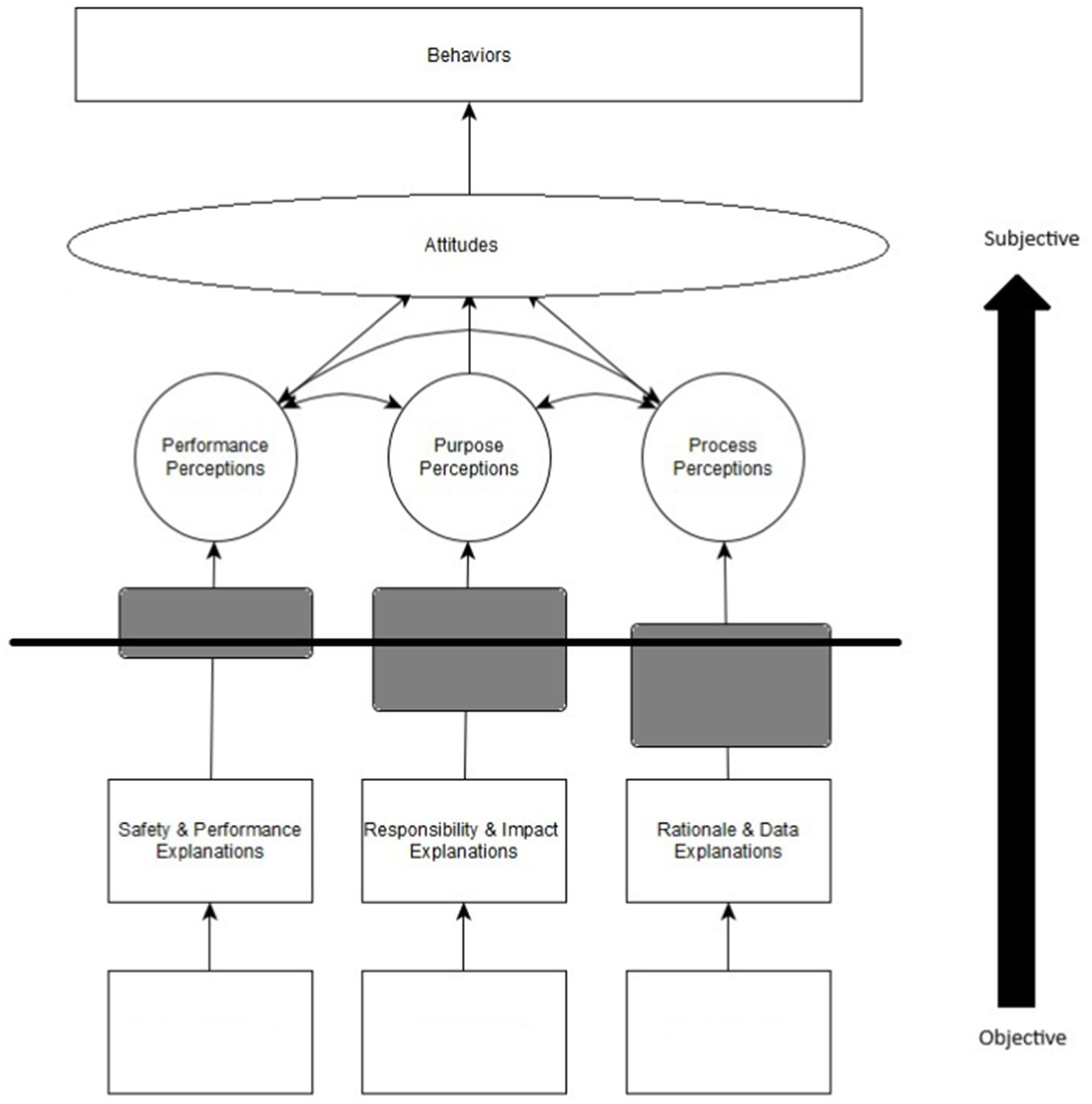 Workers attempt to make sense of the technology they utilize at the same time they are doing a given task (Muir, 1987). This links trust theoretically to trust toward AI/ML-enabled systems, and researchers have meta-analyzed data on trust-relevant constructs in human-AI/ML interactions (see Kaplan et al., 2023). As noted, XAI was developed because of the lack of transparency of black-box models like DNNs to help facilitate (dis)trust formation toward opaque systems (Sanneman and Shah, 2022). The construct of trust has been defined as an attitude (Lee and See, 2004) or willingness to be vulnerable to a referent (Mayer et al., 1995), and we adopt that definition for our model (see also Kohn et al., 2021). If the user has adequate transparency provided about the system’s performance, purpose, and process, sufficient to outweigh the uncertainty and risk of the situation, they will trust the system appropriately. Individual differences, such as domain knowledge or task knowledge, may also play a role in this process as they provide information for perceiving the referent (Hoff and Bashir, 2015). The reason “appropriate” is used denotes the importance of veridical perceptions of the system (Lee and See, 2004), and this perhaps more important as referent machine systems leveraging AI/ML/XAI capabilities increase in ubiquity and opacity (Chiou and Lee, 2023; Schlicker et al., 2025). Indeed, if a user perceives the system to have low performance, purpose, and process, to the extent that their perceptions do not outweigh the perceived risk, then it is beneficial for them to not trust, i.e., distrust, the system (assuming their perceptions of the referent system are accurate). Trust should not be assumed to be beneficial in and of itself: what is important is that the user perceives the system accurately to form an intention to and ultimately rely on that system, again, what Lee and See (2004) note as calibrated trust, i.e., a correspondence between objective system capability and the user’s subjective trust toward that system informed by their perceptions.