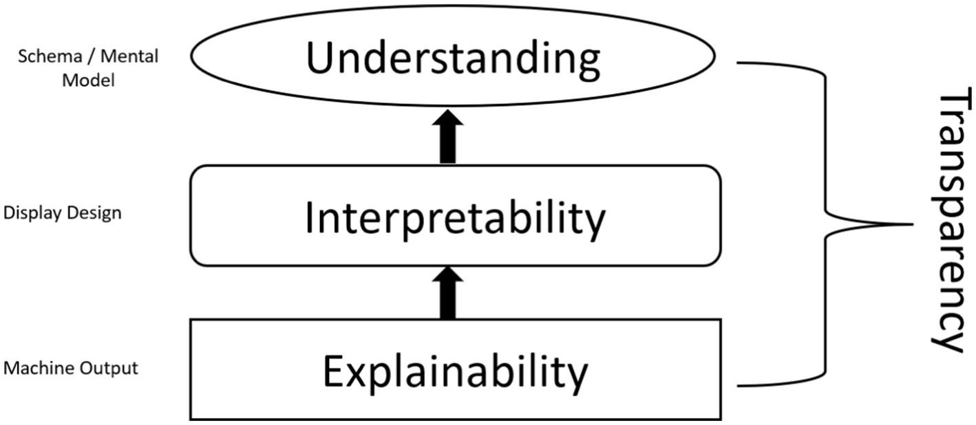 There remains confusion in the XAI literature between explainability, interpretability, and understanding often with the terms being used interchangeably (Guidotti et al., 2018; Tocchetti and Brambilla, 2022). We view all of these as the process of establishing transparency. Transparency as typically referred to in the literature is related to the user’s ability to detect how a referent system operates based on cues of the system (Lyons, 2013). However, transparency is also treated as a subjective construct in the literature (Alarcon and Willis, 2023; Chiou and Lee, 2023). Transparency pertains to the degree to which human-users are able to perceive system performance (what is the system doing), purpose (is the system being used as it was designed to be used), and process cues (how is the system doing what it is doing) as information (Chiou and Lee, 2023). A system that is transparent to one user may be opaque to another user because they lack specific knowledge, skills, or abilities (Ehsan et al., 2024; Jessup et al., 2024). Below we demarcate explainability, interpretability, and understanding within the context of transparency, with explainability being the most objective form of transparency, interpretability being a mix of objective information and subjective cognitive processing, and understanding being mainly a subjective perception or schema, as illustrated in Figure 2. In other words, transparency is the process of establishing ascriptions of an AI/ML-XAI-enabled system through information provided by cues in the environment.