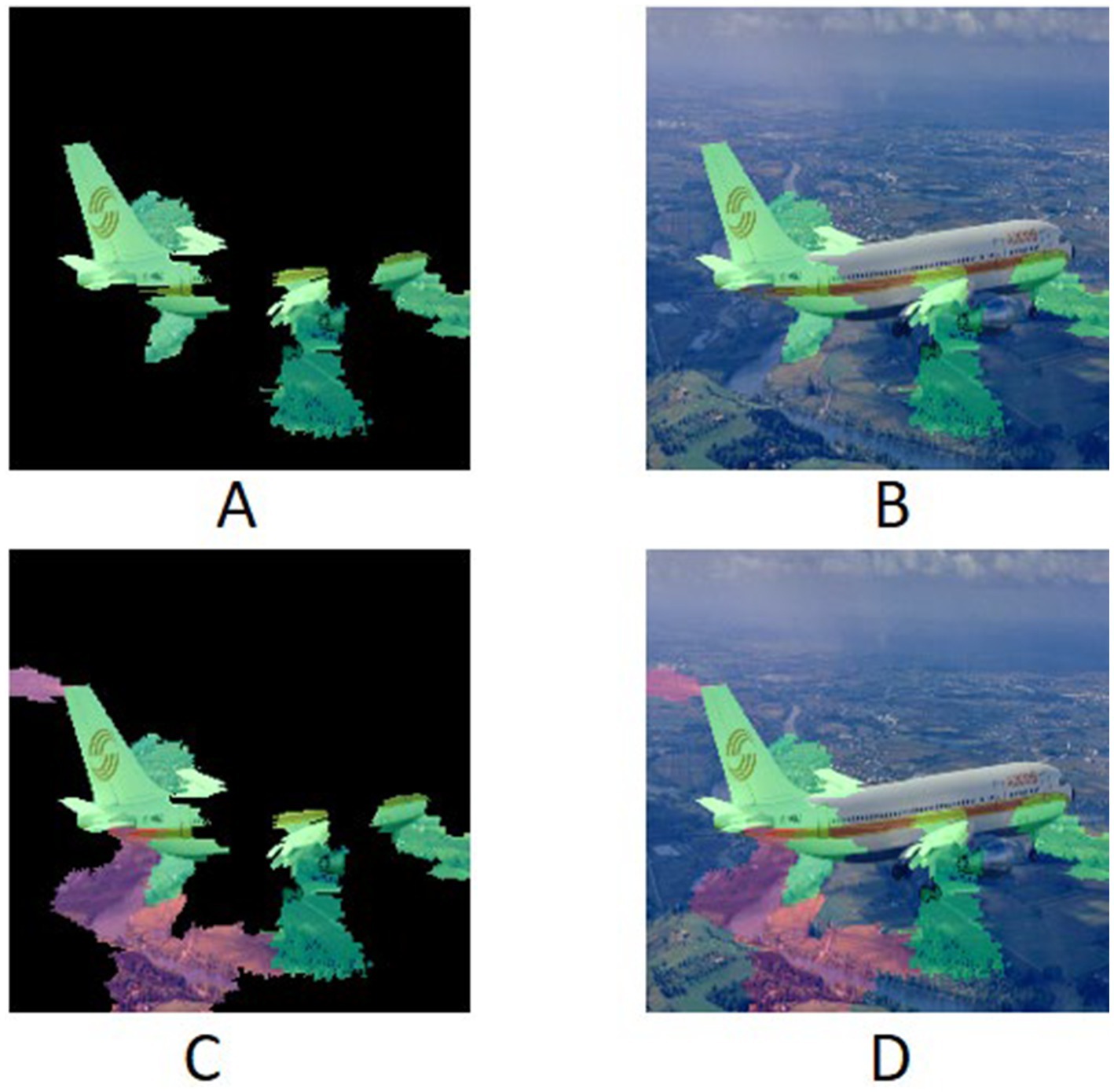 Figure 3. Locally interpretable model-agnostic explanation of civilian airplane. (A) Obfuscated image with positive information highlighted; (B) non-obfuscated image with positive information highlighted; (C) obfuscated image with positive and negative information highlighted; (D) non-obfuscated image with positive and negative information highlighted.