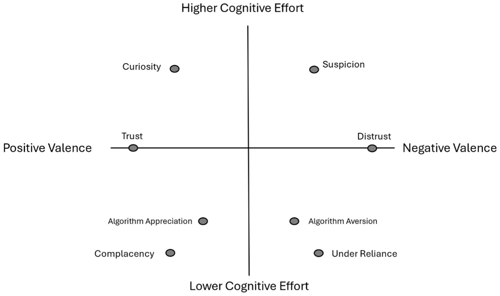 We theorize multiple attitudes toward AI/ML/XAI fall on a two-dimensional plane of valence and cognitive effort as they are a function of both dimensions, as illustrated in Figure 5. Lee and See (2004) are most famous for defining and explicating what it means to have calibrated trust, which is the correspondence between objective system capability and the user’s subjective trust toward that system informed by their perceptions of that system. Trust calibration was originally introduced in the Human Factors literature concerning trust in automation and has since been adopted and expanded in the human-machine interaction literatures, including human-robot interaction (e.g., Alarcon et al., 2023), human-autonomy interaction (e.g., Capiola et al., 2023), and human-AI/ML interaction (e.g., Harris et al., 2024; Schlicker et al., 2025; for a review, see Kohn et al., 2021). In the present model, calibrated attitudes fall on the x-axis, as they entail appropriate cognitive effort, and depending on the situation, comprise positive or negative valence resulting in trust and distrust, respectively. Calibrated trust is the goal, but other psychological attitude states may occur that fall on these two axes. When high or low cognitive effort is inappropriately employed, other states such as suspicion, curiosity, complacency, and under reliance can occur. We talk about each of these constructs in relation to the model in Figure 5.