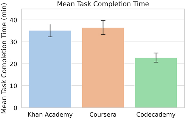 Figure 1. Mean task completion time across platforms. This figure illustrates Codecademy's significantly faster task completion times compared to Khan Academy and Coursera. Error bars represent standard error of the mean.
