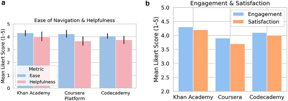 Figure 2. Participant ratings of the user experience. (a) Shows consistent ease of navigation but neutral ratings for adaptive feature helpfulness across all platforms. (b) Highlights that Khan Academy led in both self-reported engagement and satisfaction.