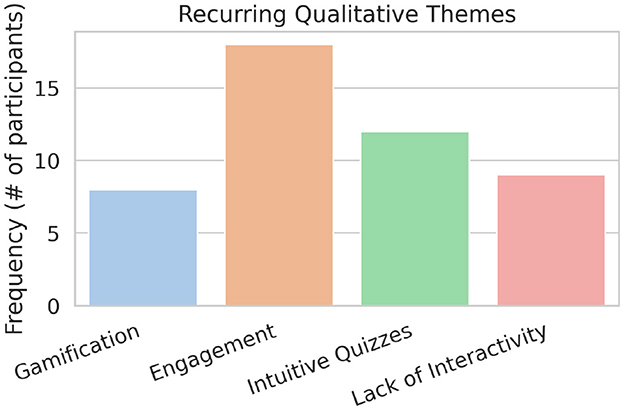 Figure 3. Frequency of recurring themes from qualitative data. The chart shows “Engagement” and “Intuitive Quizzes” were the most frequently mentioned positive themes, while “Lack of Interactivity” was a common critique. Bars represent the number of participants who mentioned each theme.