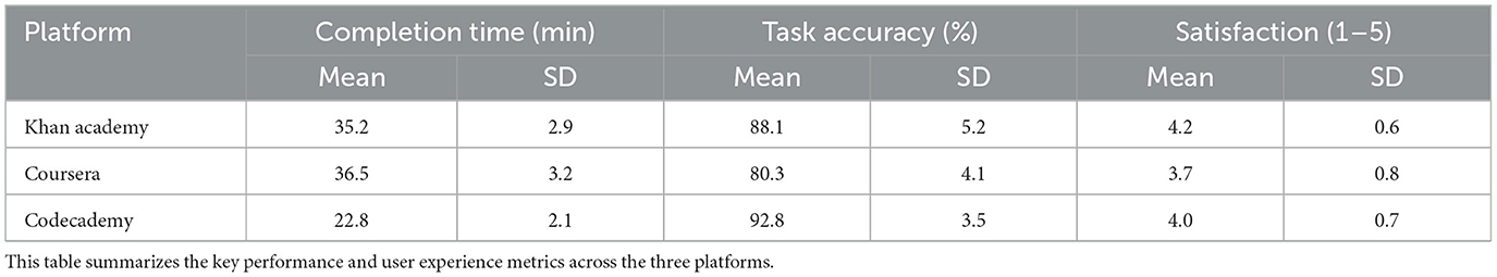The key quantitative results for task completion time, accuracy, and user satisfaction across the three platforms are summarized in Table 1. A one-way repeated-measures ANOVA revealed a significant main effect of platform on task completion time, F(2, 44) = 8.31, p < 0.001, η2 = 0.27. Mean completion times varied substantially, with Codecademy being the most efficient (M = 22.8 min, SD = 2.1), followed by Khan Academy (M = 35.2 min, SD = 2.9) and Coursera (M = 36.5 min, SD = 3.2). Post-hoc analyses confirmed that Codecademy was significantly faster than both Khan Academy (p = 0.002) and Coursera (p < 0.001) (Figure 1).