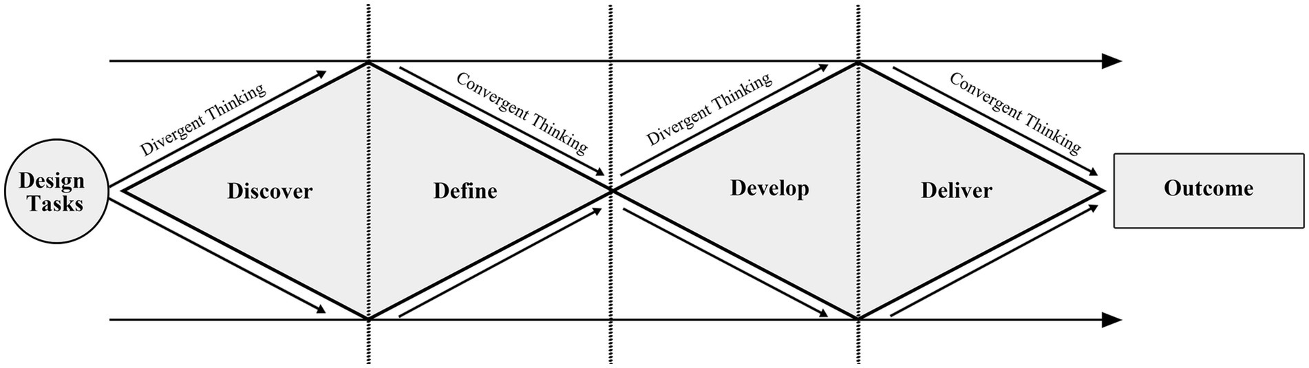 As shown in Figure 1, originally proposed by the UK Design Council, the Double Diamond Design Model provides a structured framework for understanding the stages and cognitive logic underpinning design processes. The model has been used in many areas of creative work since its introduction (Design Council, 2005). It includes four main stages: Discover, Define, Develop, and Deliver. Each stage involves a shift between open exploration and focused decision-making. While the first two stages emphasize expanding and framing the problem space, the latter two focus on generating and refining potential solutions.