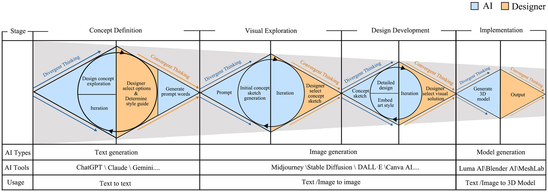 Similar to other domains, artistic design requires a high degree of creativity and advanced design thinking. In the divergent phase, AI tools such as Midjourney and ChatGPT enable designers to quickly generate a large volume of ideas and conceptual directions, pushing the boundaries of creative exploration. During the convergent phase, designers engage in critical filtering, evaluation, and restructuring of the AI-generated content, selecting the most promising directions and integrating their own esthetic judgment to ensure that the final creative output is expressed with clarity and visual coherence.
