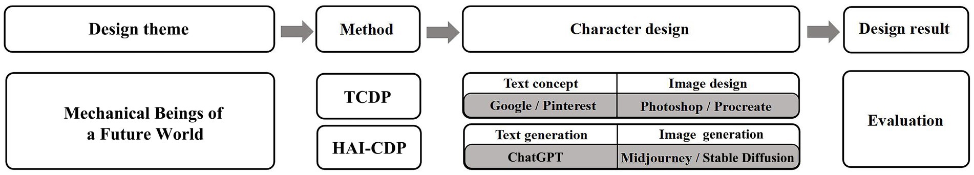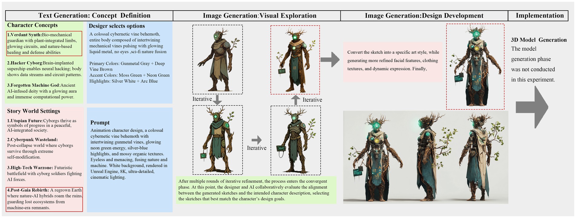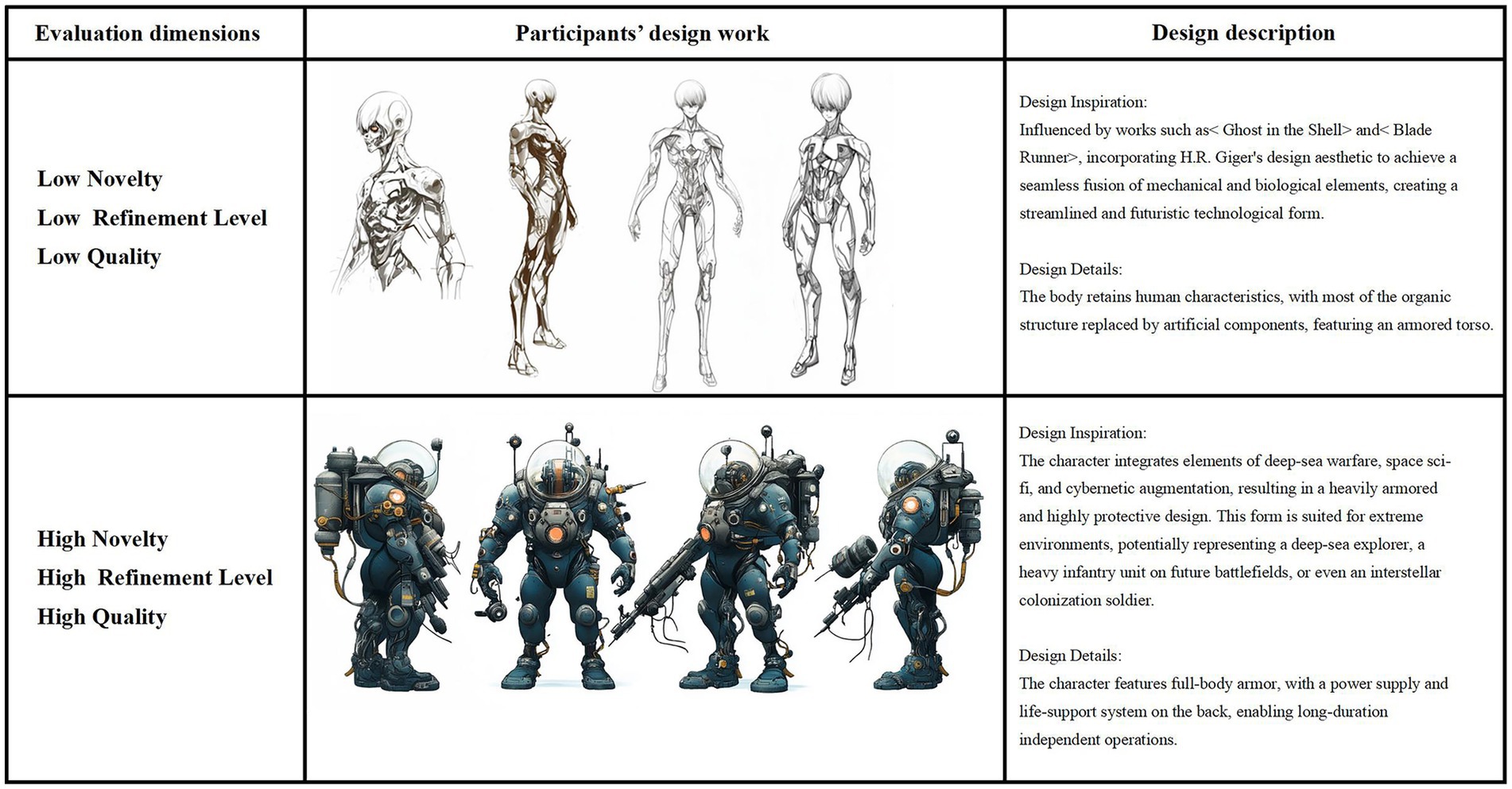 This study aims to compare the impact of the Human–AI Co-Creative Design Process and the Traditional Creative Design Process on creative performance in design. The design task focused on a character development theme entitled “Mechanical Beings of a Future World.” The theme brings together elements of future environments, biological traits, and mechanical structures. It gives designers a broad scope to explore creative ideas and visual possibilities. Conducted entirely online, the experiment required each participant to complete character concept design within a 48-h time frame. Participants were instructed to generate a range of conceptual designs and submit a written rationale detailing the design’s inspiration, defining features, and core conceptual narrative.
