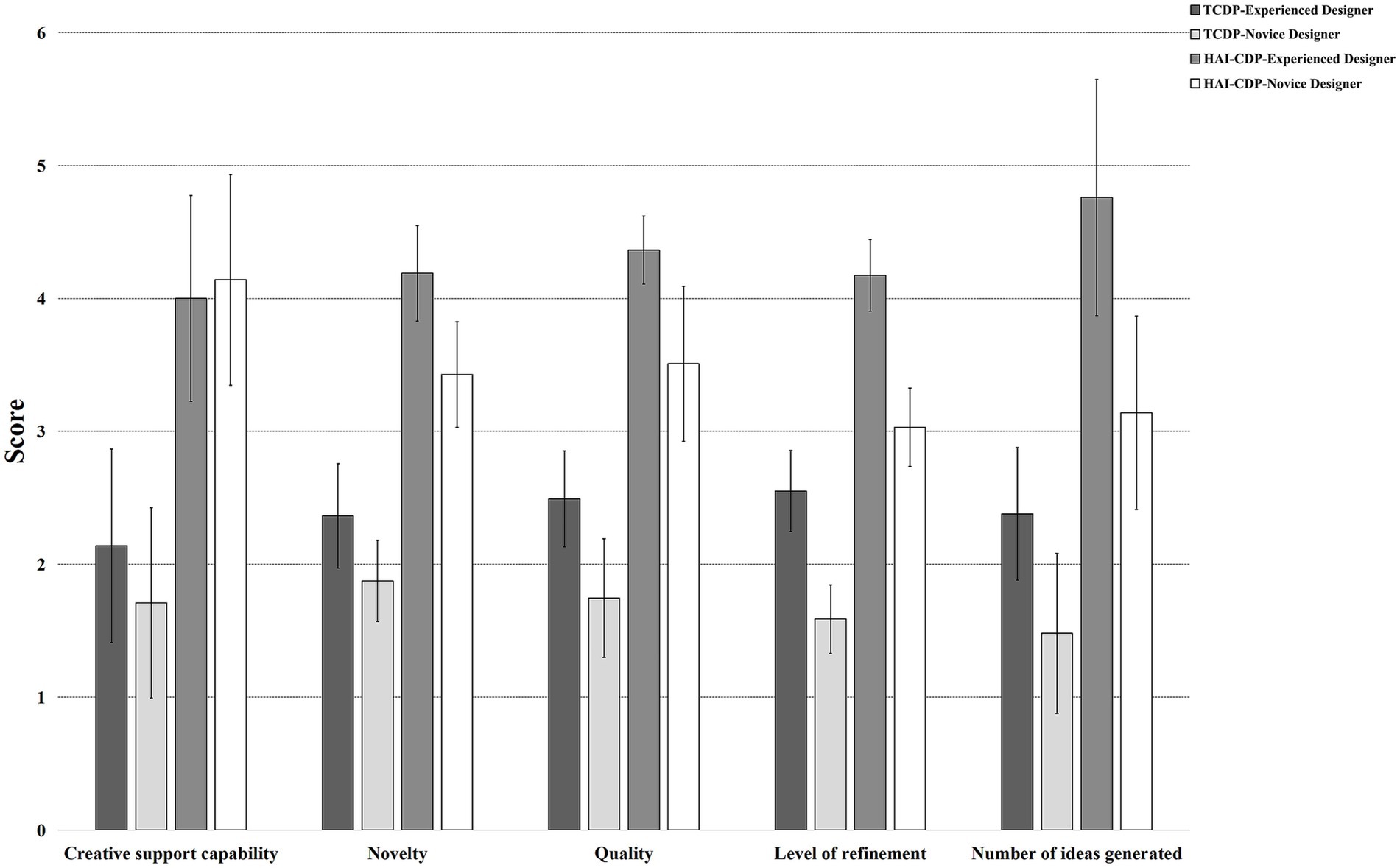 Although the HAI-CDP helped reduce the gap in perceived creative support between novice and experienced designers, experienced designers still achieved higher scores in novelty, quality, and refinement. This shows that while AI tools can support novice designers in generating ideas, experience remains a key factor in creative performance.