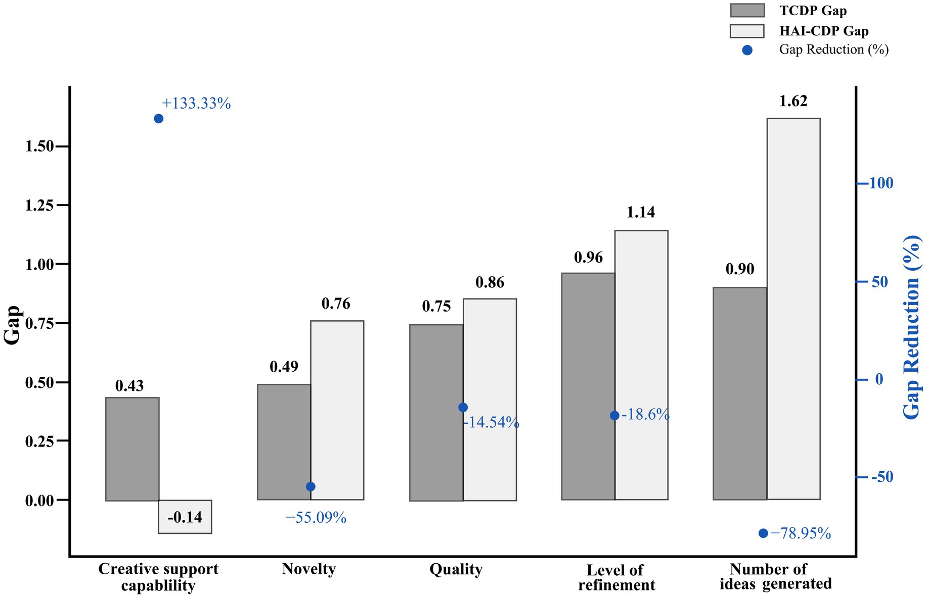 To further evaluate the effectiveness of the HAI-CDP in narrowing the creativity gap between designers, this study defines the following formula for calculating the gap reduction percentage: