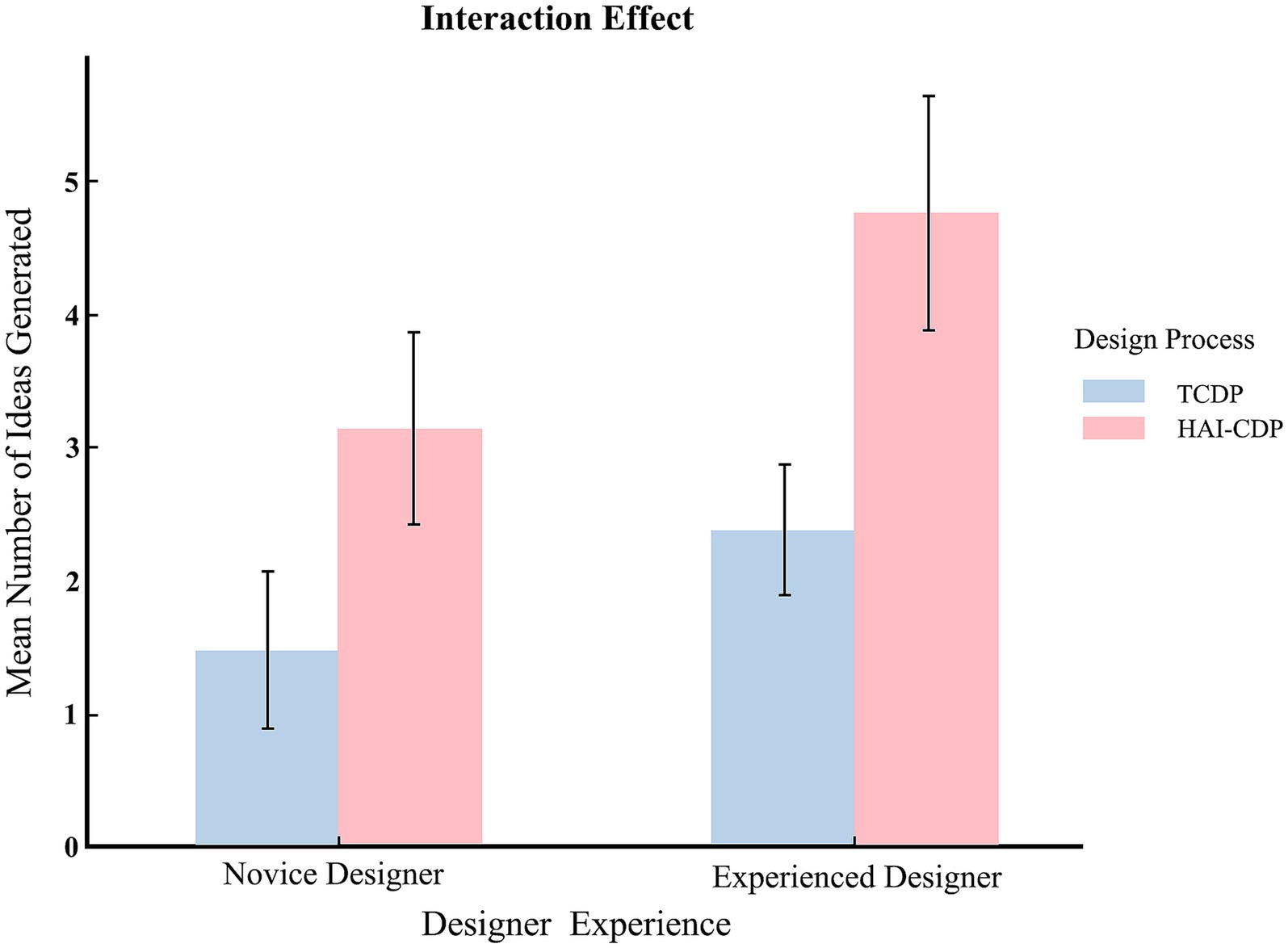 Figure 7. Interaction effect. The interaction effect was significant only for the number of ideas generated, and the Human–AI Co-Creative Design Process particularly benefited novice designers in this dimension.