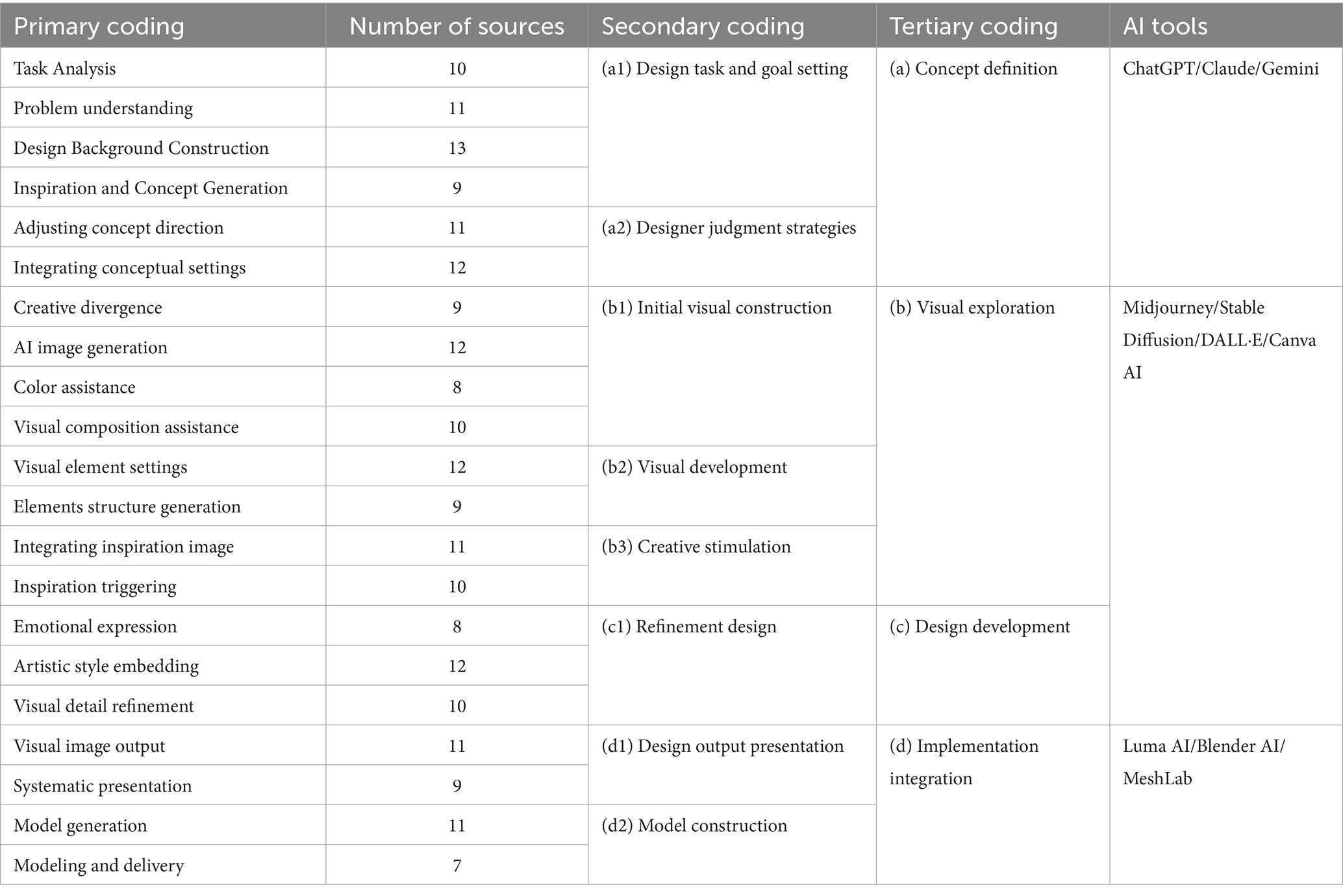To enhance the reliability of the analysis, two researchers independently completed the initial coding and resolved discrepancies through multiple rounds of discussion until full agreement was reached. Table 1 summarizes the hierarchical mapping from primary codes to secondary categories and finally to the four overarching stages, along with representative AI tools associated with each stage of the design process.