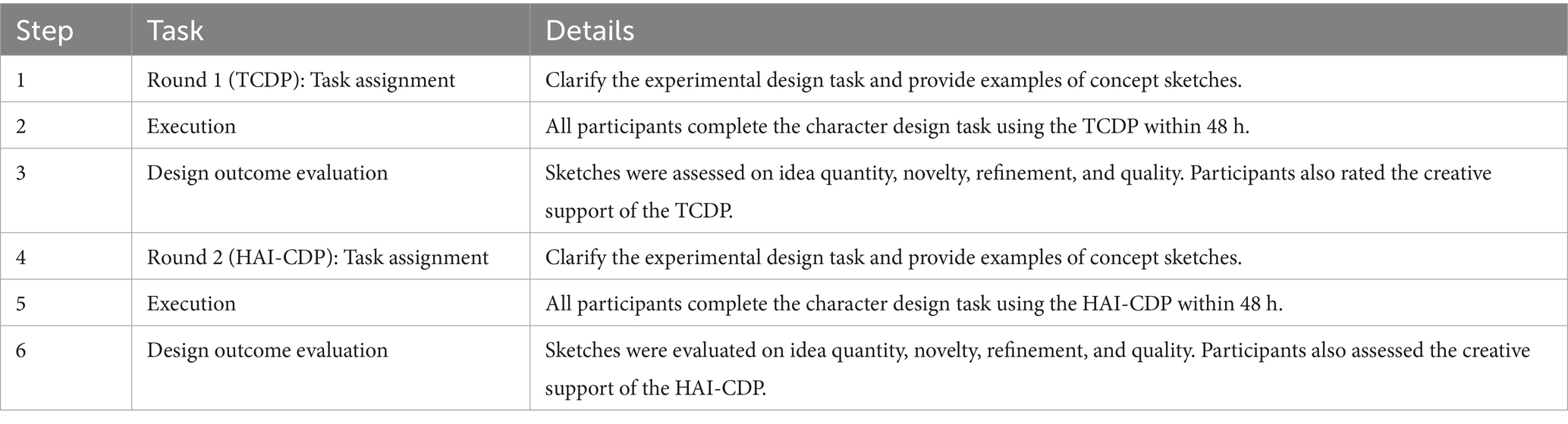 Prior to the experiment, a brief online training session was conducted to ensure that all participants fully understood the experimental procedure, the tools permitted at each stage, and the specific objectives of the task. Participants were instructed to strictly follow the experimental workflow and tool configuration as outlined in Table 2 and Figure 3. To maintain consistency, they were required to document the tools used at each stage of the process. All participants first completed the TCDP phase and then proceeded to the HAI-CDP phase. This sequence was adopted to establish a baseline for the Traditional Creative Design Process before introducing AI support, thus preventing ideas generated under the Human–AI Co-Creative Design condition from carrying over into the traditional creative design context. This arrangement ensured that the human-only baseline remained uncontaminated and provided a clearer foundation for comparing the two processes.