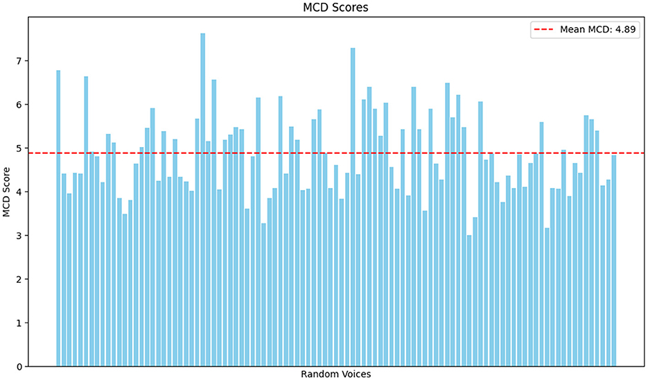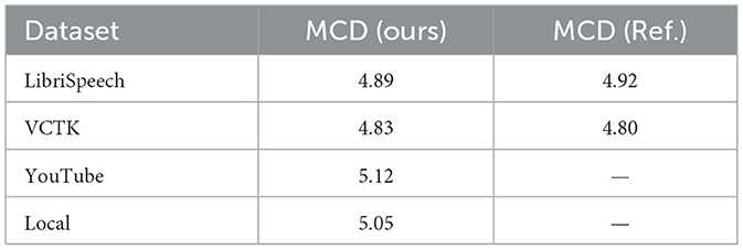 In the case of the LibriSpeech data, the proposedsystem has an MCD of 4.89, compared to an MCD of 4.92 of the reference system. This indicates that proposedmodel can reproduce clean and high-quality speech with little spectral damage. The MCD of the VCTK dataset is 4.83 which is very close to the reference value of 4.80. This result once again contributes to the notion that proposedmodel can be generalizable to various datasets, even datasets that entail different speakers and dialects. In the case of the YouTube dataset, proposedsystem gets an MCD of 5.12, which is quite a bit larger than the reference system, especially owing to the relatively used background noise and distortion among the dataset. Finally, the proposed system has an MCD of 5.05 in the Local dataset, which implies that it will be practiced even within noisy and real-world scenarios.