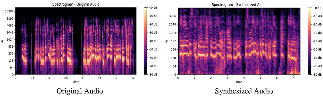 We also used spectrogram analysis to further verify the quality of speech delivered by the synthesized speech. Figure 3 shows a comparison between the synthesized utterances and those of original utterances. The example shows the resemblance between the two especially in matching the formants and the energy distribution. Preservation of the especially important vowel articulation and speech intelligibility through formants is good in the synthesized speech demonstrating that the spectralgrams reveal this. Also, there is consistent energy distribution in varying frequencies between the original and the synthesized spectrogram, which is one of the main markers of a high-quality synthesis. The spectrograms that are visually coincident with each other as well as low values of MCD are further indicators of high spectral fidelity of the proposed system. This discussion proves that the speech that is synthesized, not only sounds natural, but also shares certain features with the original speech in terms of its acoustic properties.