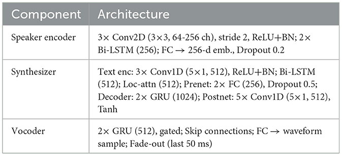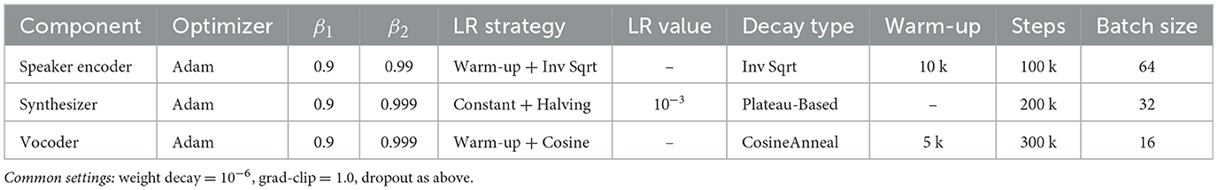 The hyperparameters are expressed below and summarized in the Table 2. Speaker-encoder training employs the Adam optimizer with β1 = 0.9, β2 = 0.99. The learning rate was warmed up over the first 10,000 iterations and then decayed according to an inverse-square-root schedule. We trained for 100k steps with a batch size of 64. The Tacotron synthesizer was trained with Adam (β1 = 0.9, β2 = 0.999) at a constant learning rate of 10−3, halving the rate whenever validation loss plateaued. The training is run for 200k steps using a batch size of 32. The modified WaveRNN vocoder also employs Adam (β1 = 0.9, β2 = 0.999), with a 5k-step warm-up followed by cosine-annealing decay. We trained the model for 300k steps with a batch size of 16. All three components use weight decay of 10−6, gradient clipping at norm 1.0, and the dropout rates specified in their respective architectures.
