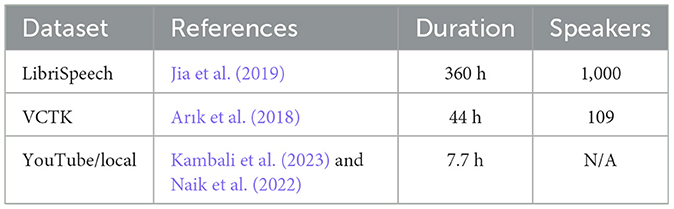 Kadam, S., Jikamade, A., Mattoo, P., and Hole, V. (2024). “Revoice: a neural network-based voice cloning system,” in 2022 IEEE 7th International Conference for Convergence in Technology (I2CT) (Pune: IEEE). doi: 10.1109/I2CT61223.2024.10543448
