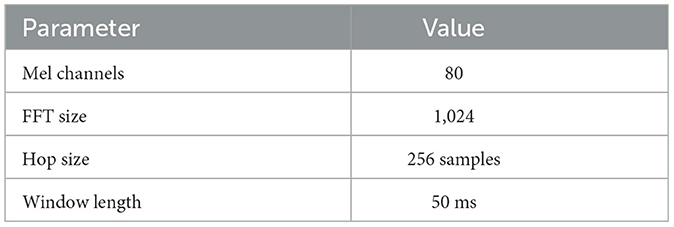 All of the audio data from these datasets are resampled to 16 KHz as a means of standardizing the input data. The audio is also normalized so that the amplitude levels are uniform, and the audio is cut in regions of silence to remove unnecessary chunks of audio, so that the models can concentrate on relevant speech content. All in all audios are resampled to 16 kHz with amplitude normalization and removal of silences. Mel-spectrogram features are extracted by parameters in Table 4 which are selected according to papers (Li and Chen, 2020; Klapsas et al., 2022) for optimal acoustic feature representation.