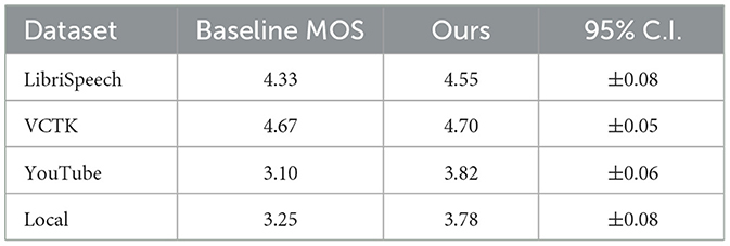 In LibriSpeech dataset, the baseline MOS is 4.33, though the proposed system obtained 4.55, which means there is a significant increase in the perceived quality of speech. Likewise with the VCTK artifact, the job of the proposed system to produce a MOS at 4.70 marginally exceeds the classifier MOS at 4.67, and this small but noticeable naturalness improvement is manifested. With the Youtube dataset, the change in the error is positive, and the error base of 3.10 becomes 3.82 with the proposed system. This implies that the suggested model is especially successful at improving the quality of the speech in a more difficult and noisy surrounding. With the Local dataset we observe the tendency, with an improvement in the MOS that rises to 3.78 (ours) as compared to 3.25 (baseline), indicating how well the model can perform in a dataset with large noise content and variability.