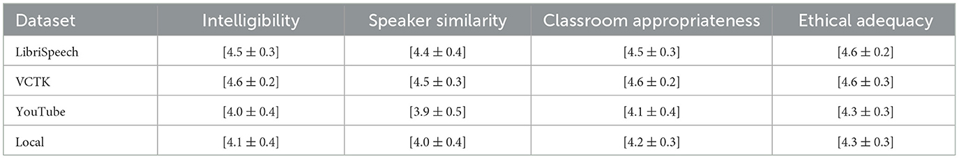 Independent evaluation and synthesis was conducted in the samples which were well balanced in terms of likelihood of LibriSpeech, VCTK, YouTube, and local condition, and short usage situations. All professionals graded four items based on 5-point Likert scales (1 indicating poor, and 5 excellent): intelligibility, familiarity of the speaker, classroom suitability and ethical adequacy. Kendall's W were used to measure inter-rater agreement and alpha was used to measure robustness to ordinal scales as presented in the Tables 7, 8 respectively. They were also given open-ended comments that were coded thematically by identifying barriers and opportunities that can be used in schools.