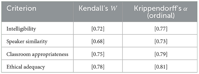 A panel of five specialists in speech-language education independently evaluated and synthesized samples, which were balanced across LibriSpeech, VCTK, YouTube, and local conditions, along with brief usage scenarios. Each expert rated four criteria using 5-point Likert scales (1 = poor, 5 = excellent): intelligibility, speaker similarity, appropriateness for classroom use, and ethical adequacy. Inter-rater agreement was quantified using Kendall's W, and robustness to ordinal scales was assessed with Krippendorff's α as shown in the Tables 7, 8, respectively. Additionally, open-ended comments were subjected to thematic coding to identify barriers and opportunities for deployment in school settings.