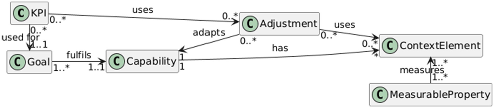 The findings from the literature review are used to formulate the key requirements for the cybersecurity management solution. The requirements are further elaborated and formalized using the CDD method. Figure 2 shows the key concepts used in capability modeling, such as goals, capabilities, adjustments, context elements, and measurable properties. The Goal element defines the organization’s security goals measured by Key Performance Indicators (KPI). Security capabilities are developed to achieve the goals. The capability delivery is affected by the external context defined by the ContextElement concept. The ContextElement is measured by measurable properties, which are raw data gathered at the organization or externally. The context element provides an interpretation of raw data. The Adjustment element defines adaptive actions invoked in response to changes in the context and aimed at achieving the organization’s goals. The capability model is elaborated using these concepts in the design session involving cybersecurity specialists. The initial version of the model was developed following the findings in the literature review, and the model was further refined by the experts.