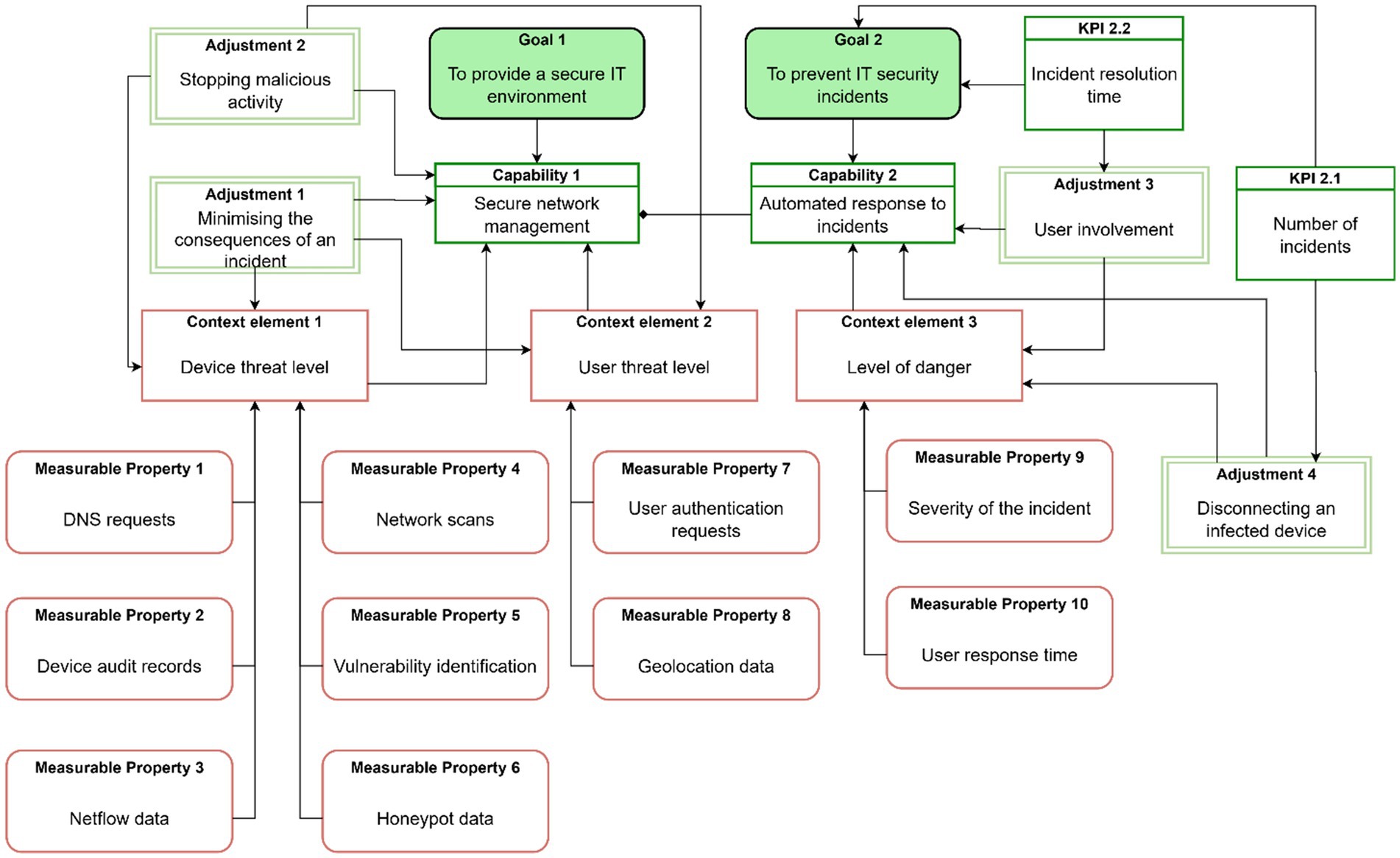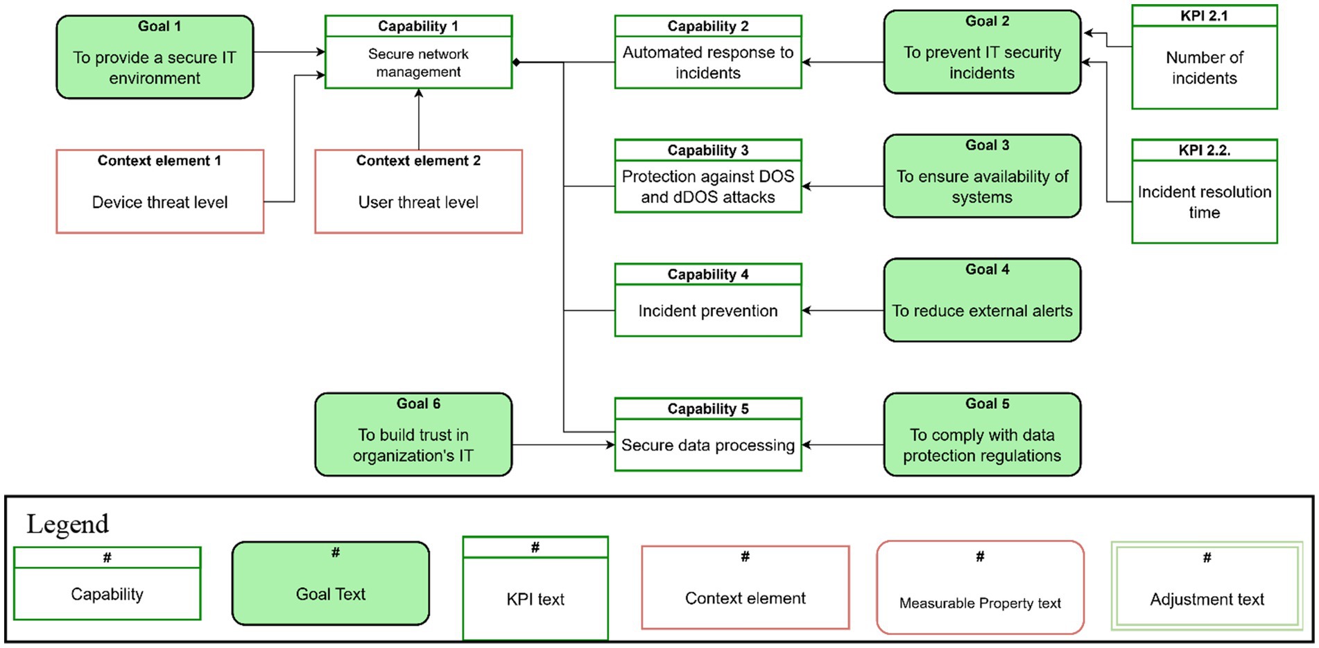 Figure 3 shows a fragment of the capability model focusing on capabilities and goals. The model defines five key capabilities, starting with Secure network management. This capability is supported by the Automated response to incidents, Protection against DOS and dDOS attacks, Incident prevention, and Secure data processing capabilities. The capabilities allow reaching the goals of monitoring, preventing, and responding to security incidents in a timely manner. For example, the organization has the Goal 3: To ensure availability of systems goal, having the Capability 3: Protection against DOS and dDOS attacks enables achieving this goal. This results in a secure IT environment for employees and builds both internal and external trust in the organization’s IT. The goals are measured by their respective KPI (the model fragment shows just exemplary KPI for representation clarity). For example, the Goal 2: To prevent IT security incidents goal is measured by two KPIs, namely, the number of incidents and the incident resolution time. The capability delivery is affected by context, such as Device threat level and User threat level. The context elements provide an actionable interpretation of measurable properties representing raw data measurements (Figure 4).