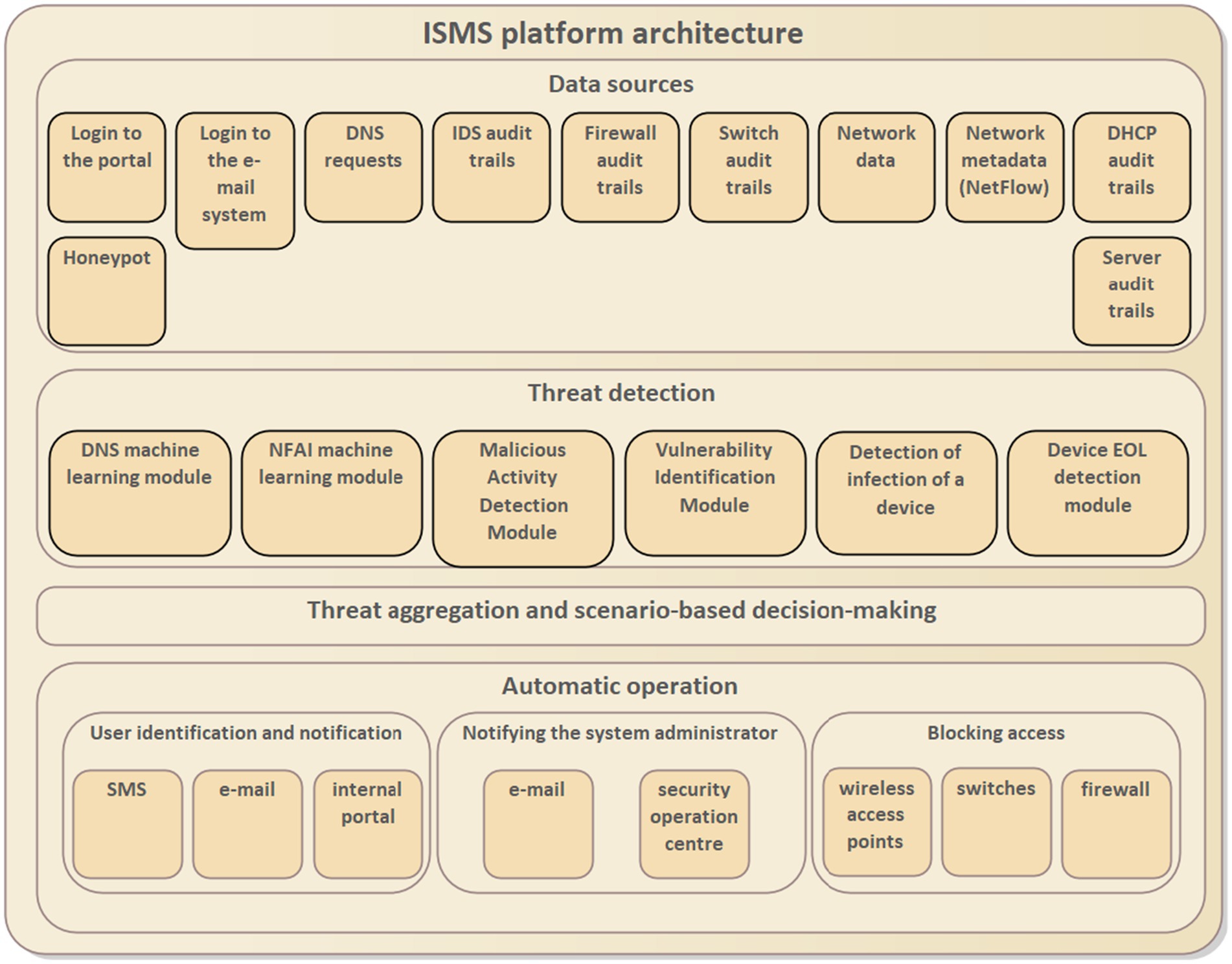 The automated cybersecurity monitoring and response system is implemented to deliver the identified security management capabilities. The solutions architecture has three layers, namely, Data sources, threat detection, and autonomic operations (Figure 5). The threat aggregation and decision-making component orchestrates the threat handling and response activities. The data sources layer contains components for retrieving and pre-processing input data as specified in the requirements. The data includes portal and e-mail system login records, DNS requests, IDS audit trails, firewall audit trails, network switch audit trails, network data, network metadata (NetFlow), DHCP audit trails, server audit trails, and honeypot activity. The data input components correspond to the measurable properties, and data pre-processing leads to the calculation of the context elements in the capability model. For instance, if a user’s threat level—as determined by M365 lock data—is elevated, the user is promptly notified via SMS and email, and their immediate involvement is required to address the issue.