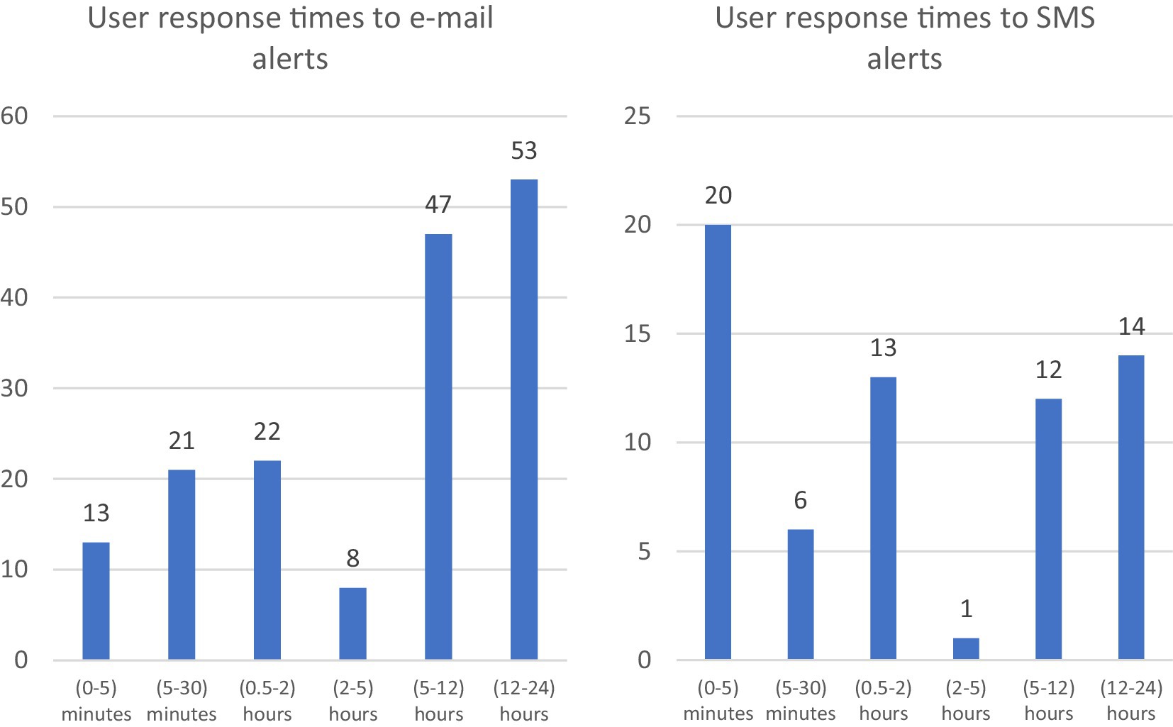 Figure 6. The user response to the time to incident notifications sent by e-mail (left) and by SMS (right).
