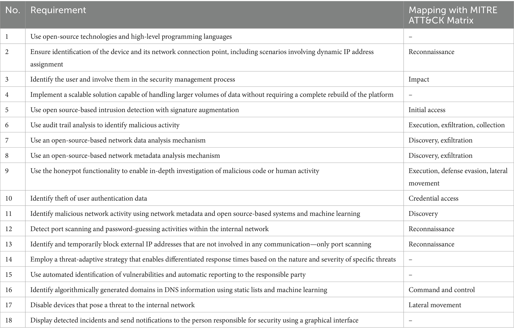 The requirements are also mapped to MITRE ATT&CK Matrix (ATT&CK, 2025). That shows that threats in 11 out of 14 categories are addressed. The main focus areas are Reconnaissance, Discovery, Exfiltration, and Execution in line with the priorities of the monitoring and response systems. The Resource Development, Persistence, and Impact are directly considered.