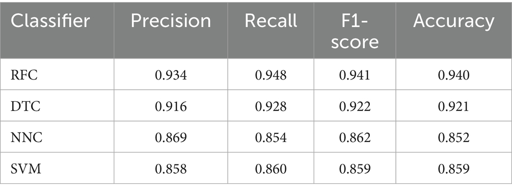 A DGA detection model was developed and evaluated, which aimed to find out whether a DNS request generated by the device can be classified as a DGA and thus be considered a malicious request. Experiments were performed on the selection criteria of DGA domains as well as on the construction of feature clusters. A set of features for training DNS classifiers was developed based on the work of Selvi and Rodríguez (2019) study using a set of 10 traits. The DGA module using the RFC machine learning algorithm was trained with 8,856 “bad” and 8,856 “good” domains and was compared with the Palo Alto firewall. Different classifiers were chosen to identify DGAs: Support Vector Machine (SVC), Neural Networks (NNC), Decision Trees (DTC), and Random Forests (RFC). To evaluate the performance of the classifiers, the Precision, Accuracy, Recall, and F1-score were measured for each of them using cross-validation. Table 3 shows a comparison of the ML models, showing that RFC gave the best results.