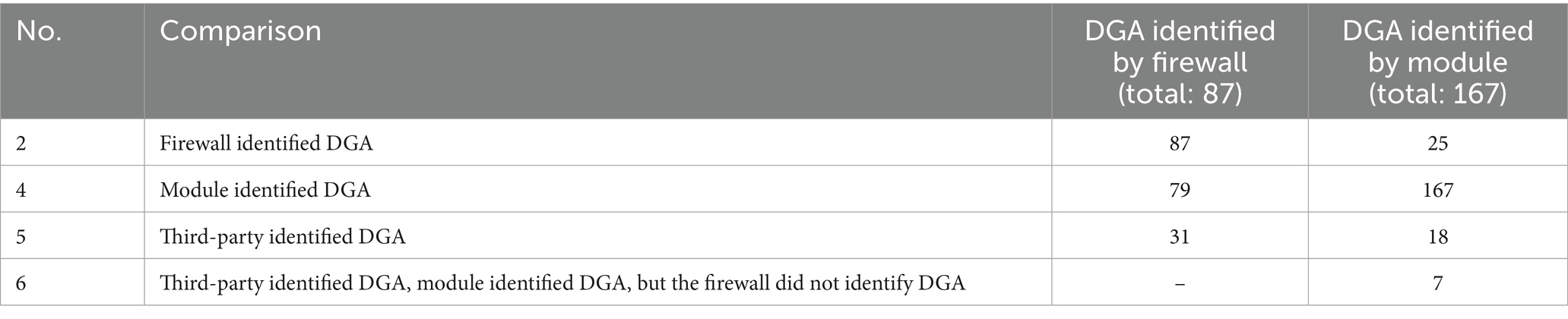 The DGA detection functionality of the system was compared with the up-to-date Palo Alto firewall. The RFC was selected for the DGA model. The evaluation was performed during the period from 1 January 2022 to 31 May 2023. Overall, 13 million DNS requests from different sources have been analyzed by the system during that period, which consisted of 195 thousand unique domain names. The DGA model identified seven additional DNS requests (Table 4) classified as DGA by a third-party source, which were not detected by the Palo Alto firewall (some of them might be false positive identifications). The results indicate that the system achieves results comparable to state-of-the-art proprietary solutions. More information about the model development is presented in Minkevics et al. (2023).