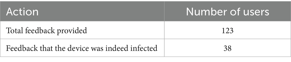 Different feedback mechanisms were used to evaluate the efficiency of the system. The users’ survey was conducted to confirm that security threats were correctly identified. Additionally, CERT. LV notifications of malicious activity at the institution were also considered. CERT. LV is the national institution responsible for handling cybersecurity incidents and promoting information technology security in Latvia, and its feedback provides an external confirmation of threat handling at the organization.
